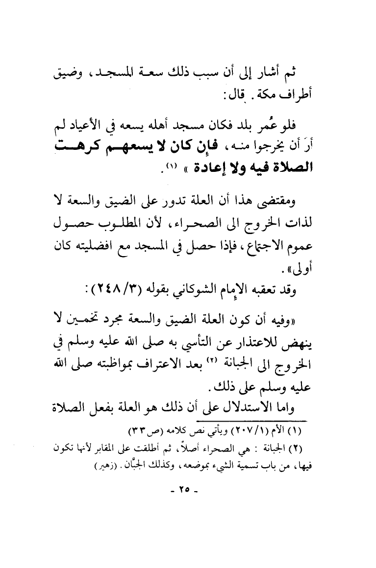 ومقتضى هذا أن العلة تدور على الضيق والسعة لا لذات الخروج إلى الصحراء لأن المطلوب حصول عموم الاجتماع فإذا حصل في المسجد مع أفضليته كان أولى.
