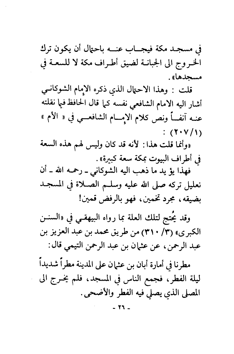 فهذا يؤيد ما ذهب إليه الشوكاني - رحمه الله - أن تعليل تركه صلى الله عليه وسلم الصلاة في المسجد بضيقه مجرد تخمين فهو بالرفض قمين!