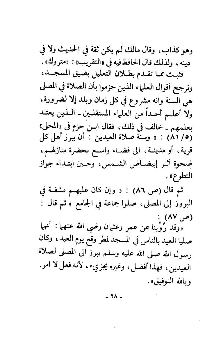فثبت مما تقدم بطلان التعليل بضيق المسجد وترجح أقوال العلماء الذين جزموا بأن الصلاة في المصلى هي السنة وأنه مشروع في كل زمان وبلد إلا لضرورة ولا أعلم أحدا من العلماء المستقلين - الذين يعتد بهم - خالف في ذلك فقال ابن حزم في "المحلى" "5 / 81": "وسنة صلاة العيدين: أن يبرز أهل كل قرية أو مدينة إلى فضاء واسع بحضرة منازلهم ضحوة أثر إبيضاض الشمس وحين ابتداء جواز التطوع".