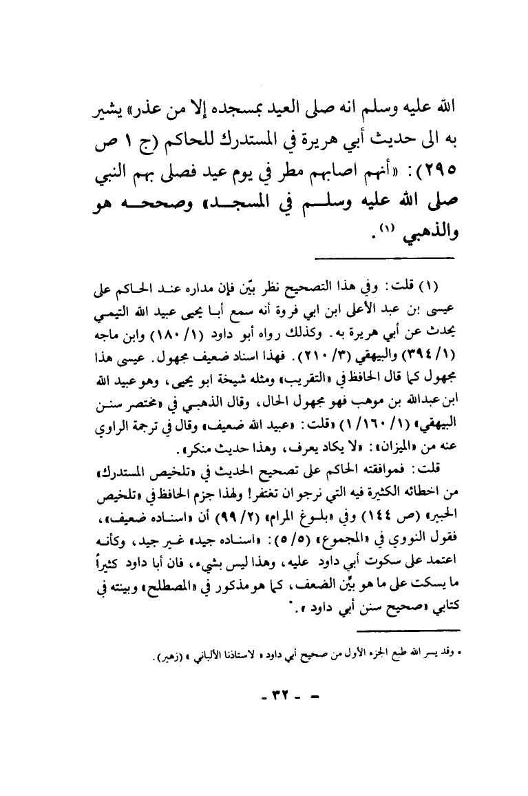 1 قلت: وفي هذا التصحيح نظر بين فإن مداره عند الحاكم على عيسى بن عبد الأعلى ابن أبى فروة أنه سمع أبا يحيى عبيد الله التيمي يحدث عن أبي هريرة به. وكذلك رواه أبو داود "1 / 180" وابن ماجه "1 / 394" والبيهقي "3 / 210". فهذا إسناد ضعيف مجهول. عيسى هذا مجهول كما قال الحافظ في " لتقريب " ومثله شيخه أبو يحيى وهو عبيد الله ابن عبد الله بن موهب فهو مجهول الحال وقال الذهبي في " مختصر سنن البيهقي " "1 / 160/. قلت: "عبيد الله ضعيف" وقال في ترجمة الراوي عنه من "الميزان": "لا يكاد يعرف وهذا حديث منكر".