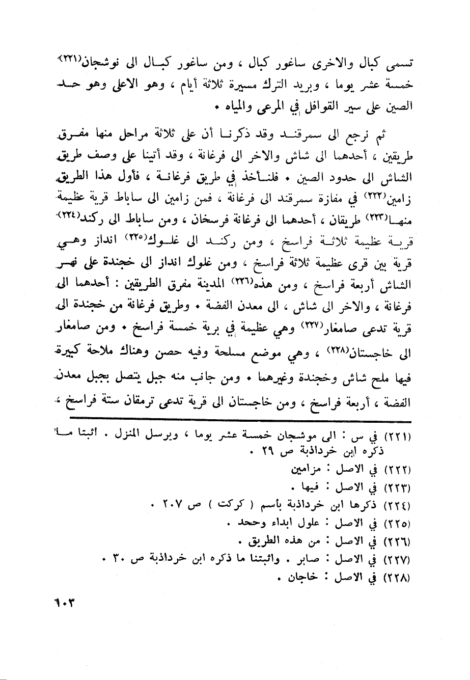 ثم نرجع الى سمرقند وقد ذكرنا أن على ثلاثة مراحل منها مفرق طريقين، أحدهما الى شاش والاخر الى فرغانة، وقد أتينا على وصف طريق الشاش الى حدود الصين. فلنأخذ في طريق فرغانة، فأول هذا الطريق زامين «222» في مفازة سمرقند الى فرغانة، فمن زامين الى ساباط قرية عظيمة منها «223» طريقان، أحدهما الى فرغانة فرسخان، ومن ساباط الى ركند «224» قرية عظيمة ثلاثة فراسخ، ومن ركند الى غلوك «225» انداز وهي قرية بين قرى عظيمة ثلاثة فراسخ، ومن غلوك انداز الى خجندة على نهر الشاش أربعة فراسخ، ومن هذه «226» المدينة مفرق الطريقين: أحدهما الى فرغانة، والاخر الى شاش، الى معدن الفضة. وطريق فرغانة من خجندة الى قرية تدعى صامغار «227» وهي عظيمة في برية خمسة فراسخ. ومن صامغار الى خاجستان «228» ، وهي موضع مسلحة وفيه حصن وهناك ملاحة كبيرة فيها ملح شاش وخجندة وغيرهما. ومن جانب منه جبل يتصل بجبل معدن الفضة، أربعة فراسخ، ومن خاجستان الى قرية تدعى ترمقان ستة فراسخ،