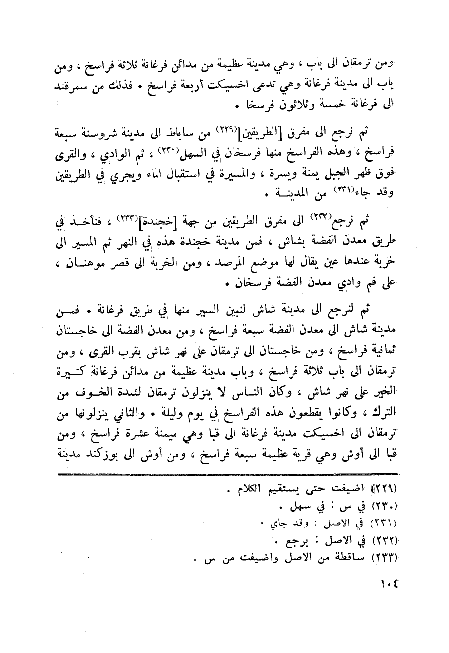 ثم لنرجع الى مدينة شاش لنبين السير منها في طريق فرغانة. فمن مدينة شاش الى معدن الفضة سبعة فراسخ، ومن معدن الفضة الى خاجستان ثمانية فراسخ، ومن خاجستان الى ترمقان على نهر شاش بقرب القرى، ومن ترمقان الى باب ثلاثة فراسخ، وباب مدينة عظيمة من مدائن فرغانة كثيرة الخير على نهر شاش، وكان الناس لا ينزلون ترمقان لشدة الخوف من الترك، وكانوا يقطعون هذه الفراسخ في يوم وليلة. والثاني ينزلونها من ترمقان الى اخسيكت مدينة فرغانة الى قبا وهي ميمنة عشرة فراسخ، ومن قبا الى أوش وهي قرية عظيمة سبعة فراسخ، ومن أوش الى بوزكند مدينة