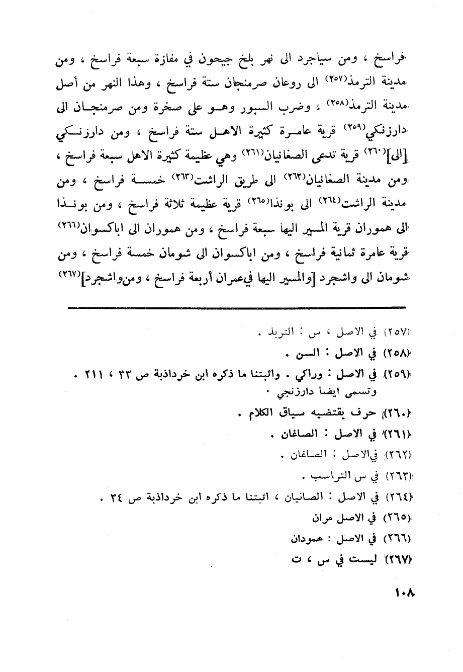 فراسخ، ومن سياجرد الى نهر بلخ جيحون في مفازة سبعة فراسخ، ومن مدينة الترمذ «257» الى روعان صرمنجان ستة فراسخ، وهذا النهر من أصل مدينة الترمذ «258» ، وضرب السبور وهو على صخرة ومن صرمنجان الى دارزنكي «259» قرية عامرة كثيرة الاهل ستة فراسخ، ومن دارزنكي [الى] «260» قرية تدعى الصغانيان «261» وهي عظيمة كثيرة الاهل سبعة فراسخ، ومن مدينة الصغانيان «262» الى طريق الراشت «263» خمسة فراسخ، ومن مدينة الراشت «264» الى بونذا «265» قرية عظيمة ثلاثة فراسخ، ومن بونذا الى هموران قرية المسير اليها سبعة فراسخ، ومن هموران الى اباكسوان «266» قرية عامرة ثمانية فراسخ، ومن اباكسوان الى شومان خمسة فراسخ، ومن شومان الى واشجرد [والمسير اليها في عمران أربعة فراسخ، ومن واشجرد] «267»