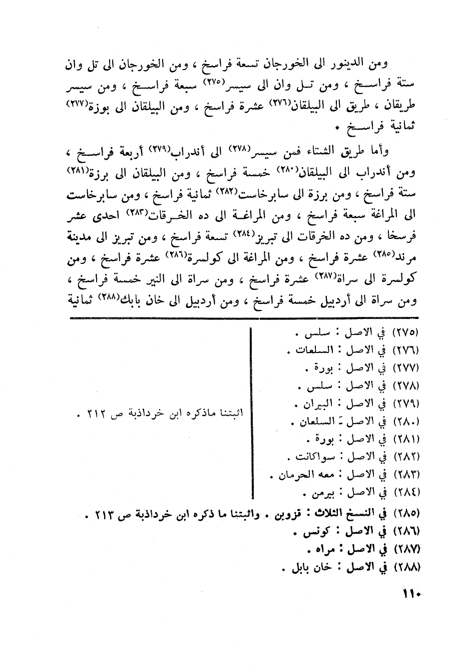 وأما طريق الشتاء فمن سيسر «278» الى أندراب «279» أربعة فراسخ، ومن أندراب الى البيلقان «280» خمسة فراسخ، ومن البيلقان الى برزة «281» ستة فراسخ، ومن برزة الى سابرخاست «282» ثمانية فراسخ، ومن سابرخاست الى المراغة سبعة فراسخ، ومن المراغة الى ده الخرقات «283» احدى عشر فرسخا، ومن ده الخرقات الى تبريز «284» تسعة فراسخ، ومن تبريز الى مدينة مرند «285» عشرة فراسخ، ومن المراغة الى كولسرة «286» عشرة فراسخ، ومن كولسرة الى سراة «287» عشرة فراسخ، ومن سراة الى النير خمسة فراسخ، ومن سراة الى أردبيل خمسة فراسخ، ومن أردبيل الى خان بابك «288» ثمانية
