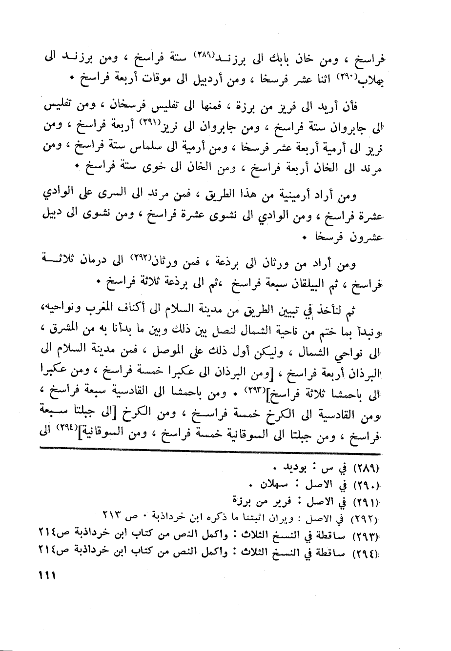 فراسخ، ومن خان بابك الى برزند «289» ستة فراسخ، ومن برزند الى بهلاب «290» اثنا عشر فرسخا، ومن أردبيل الى موقات أربعة فراسخ.