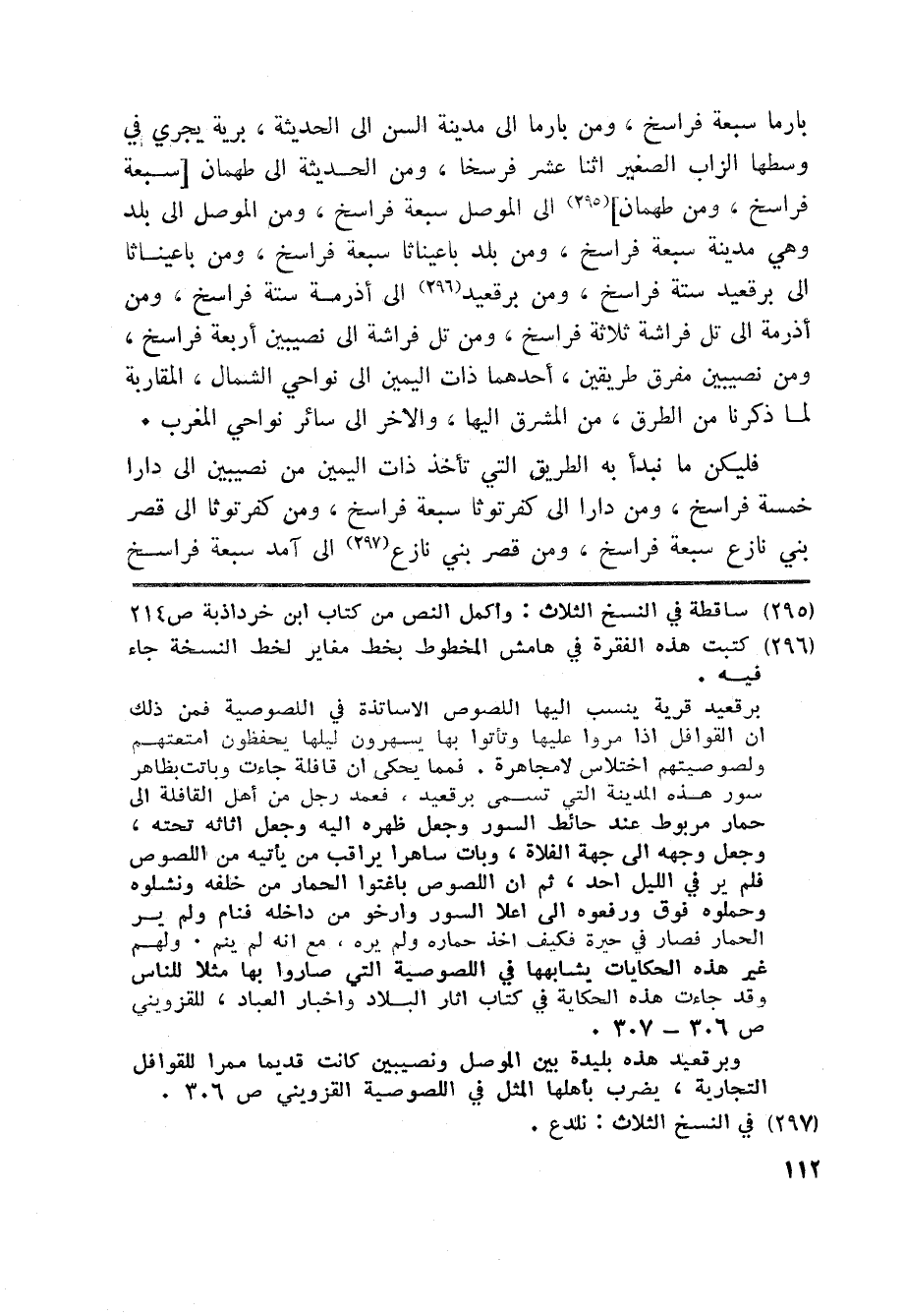 فليكن ما نبدأ به الطريق التي تأخذ ذات اليمين من نصيبين الى دارا خمسة فراسخ، ومن دارا الى كفرتوثا سبعة فراسخ، ومن كفرتوثا الى قصر بني نازع سبعة فراسخ، ومن قصر بني نازع 29»