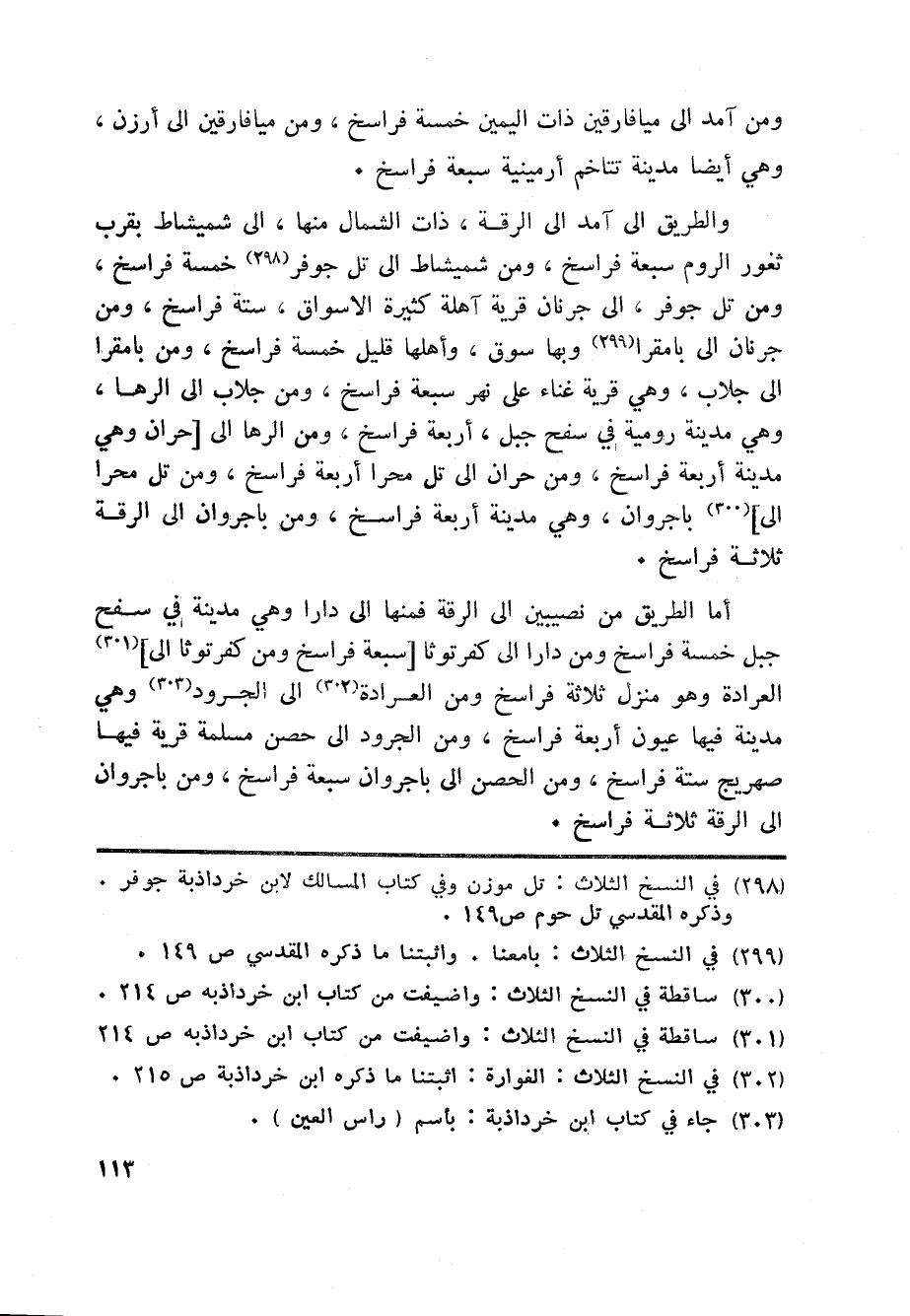 أما الطريق من نصيبين الى الرقة فمنها الى دارا وهي مدينة في سفح جبل خمسة فراسخ ومن دارا الى كفرتوثا [سبعة فراسخ ومن كفرتوثا الى] «301» العرادة وهو منزل ثلاثة فراسخ ومن العرادة «302» الى الجرود «303» وهي مدينة فيها عيون أربعة فراسخ، ومن الجرود الى حصن مسلمة قرية فيها صهريج ستة فراسخ، ومن الحصن الى باجروان سبعة فراسخ، ومن باجروان الى الرقة ثلاثة فراسخ.