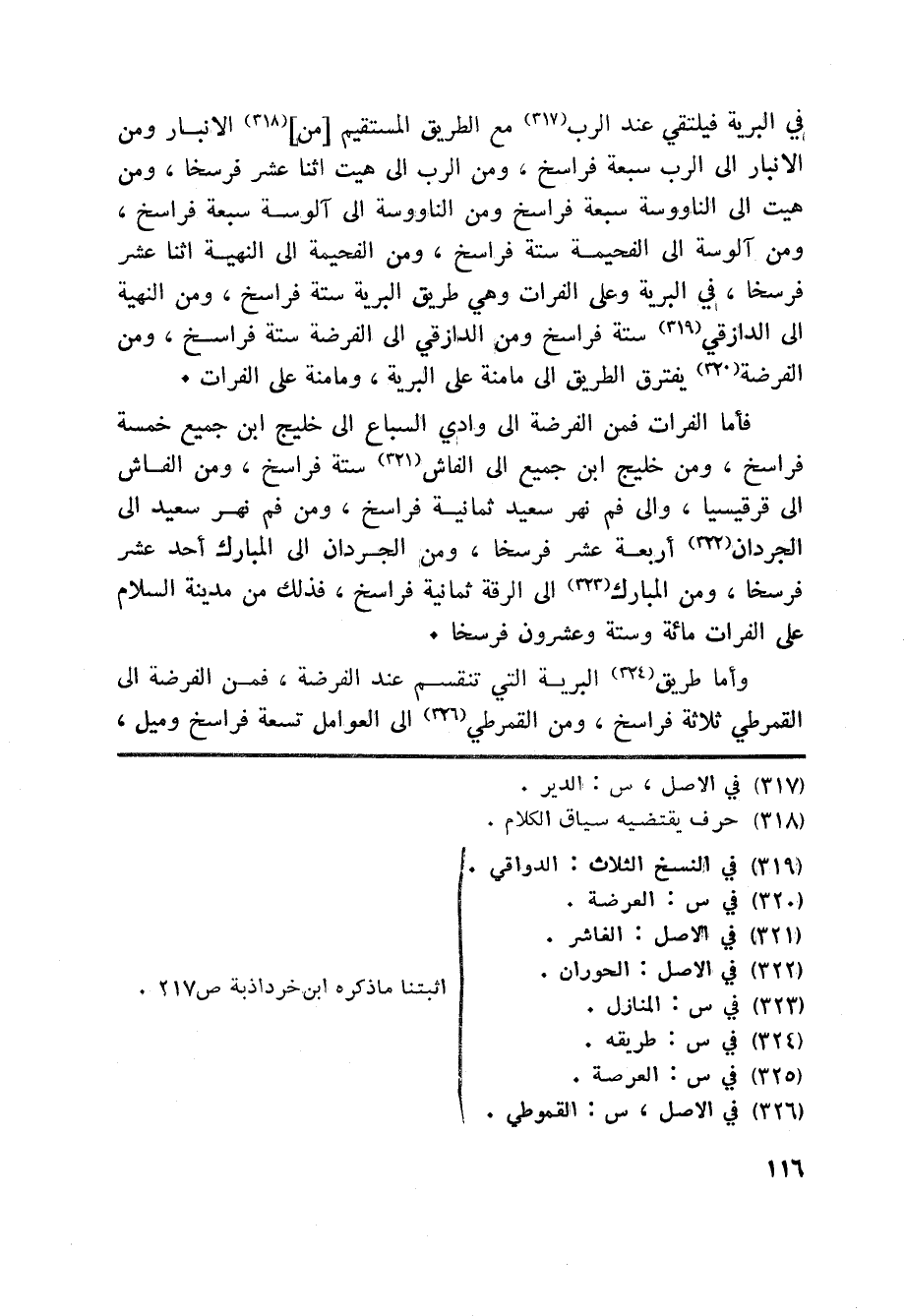 في البرية فيلتقي عند الرب «317» مع الطريق المستقيم [من] «318» الانبار ومن الانبار الى الرب سبعة فراسخ، ومن الرب الى هيت اثنا عشر فرسخا، ومن هيت الى الناووسة سبعة فراسخ ومن الناووسة الى آلوسة سبعة فراسخ، ومن آلوسة الى الفحيمة ستة فراسخ، ومن الفحيمة الى النهية اثنا عشر فرسخا، في البرية وعلى الفرات وهي طريق البرية ستة فراسخ، ومن النهية الى الدازقي «319» ستة فراسخ ومن الدازقي الى الفرضة ستة فراسخ، ومن الفرضة «320» يفترق الطريق الى مامنة على البرية، ومامنة على الفرات.