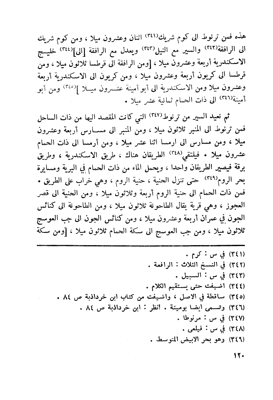 هذه فمن ترنوط الى كوم شريك «341» اثنان وعشرون ميلا، ومن كوم شريك الى الرافقة «342» والسير مع النيل «343» ويعدل مع الرافقة [الى] «344» خليج الاسكندرية أربعة وعشرون ميلا، [ومن الرافقة الى قرطسا ثلاثون ميلا، ومن قرطسا الى كريون أربعة وعشرون ميلا، ومن كريون الى الاسكندرية أربعة وعشرون ميلا ومن الاسكندرية الى أبو أمينة عشرون ميلا] «345» ومن أبو أمينة «346» الى ذات الحمام ثمانية عشر ميلا.