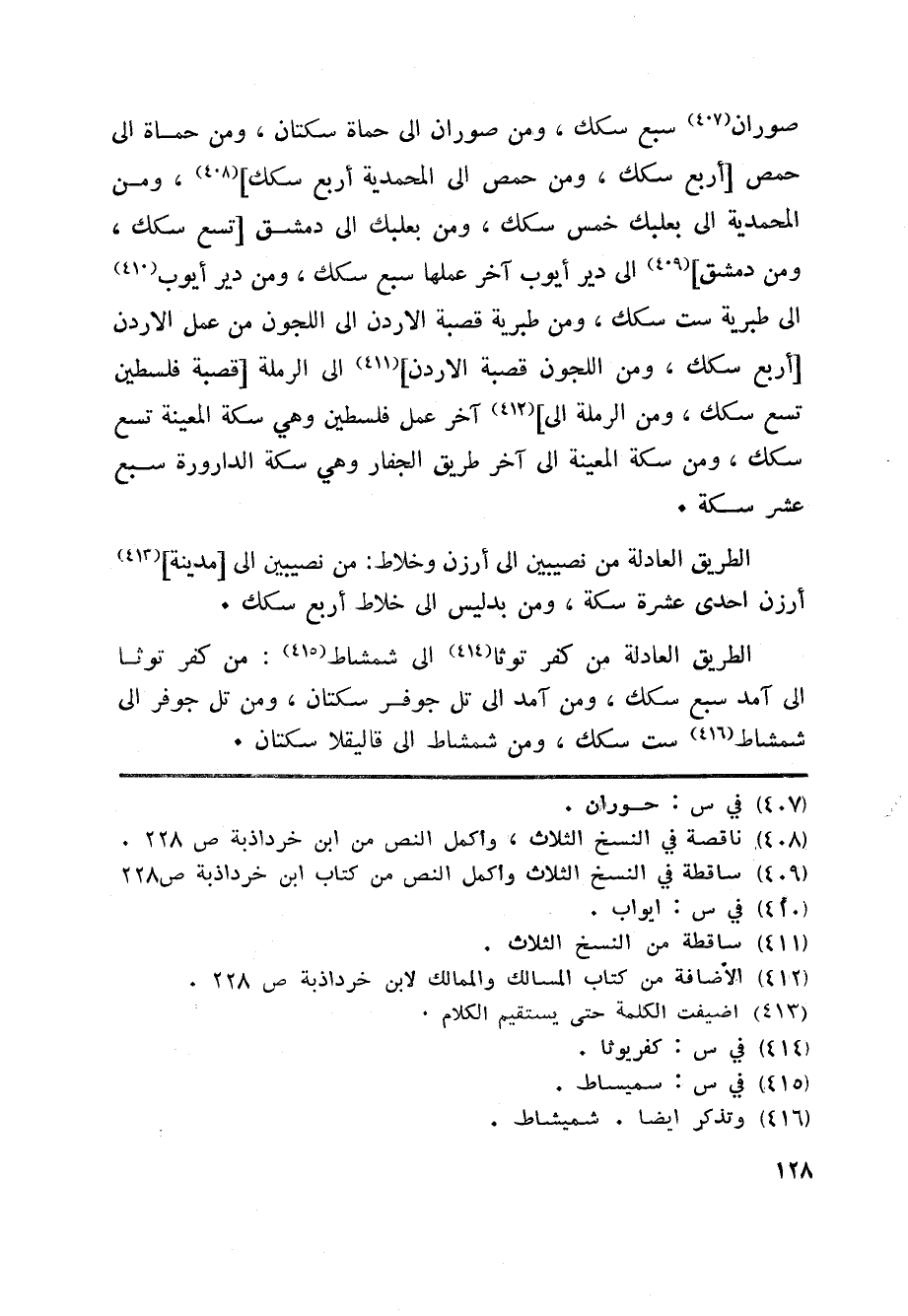 صوران «407» سبع سكك، ومن صوران الى حماة سكتان، ومن حماة الى حمص [أربع سكك، ومن حمص الى المحمدية أربع سكك] «408» ، ومن المحمدية الى بعلبك خمس سكك، ومن بعلبك الى دمشق [تسع سكك، ومن دمشق] «409» الى دير أيوب آخر عملها سبع سكك، ومن دير أيوب «410» الى طبرية ست سكك، ومن طبرية قصبة الاردن الى اللجون من عمل الاردن [أربع سكك، ومن اللجون قصبة الاردن] «411» الى الرملة [قصبة فلسطين تسع سكك، ومن الرملة الى] «412» آخر عمل فلسطين وهي سكة المعينة تسع سكك، ومن سكة المعينة الى آخر طريق الجفار وهي سكة الدارورة سبع عشر سكة.