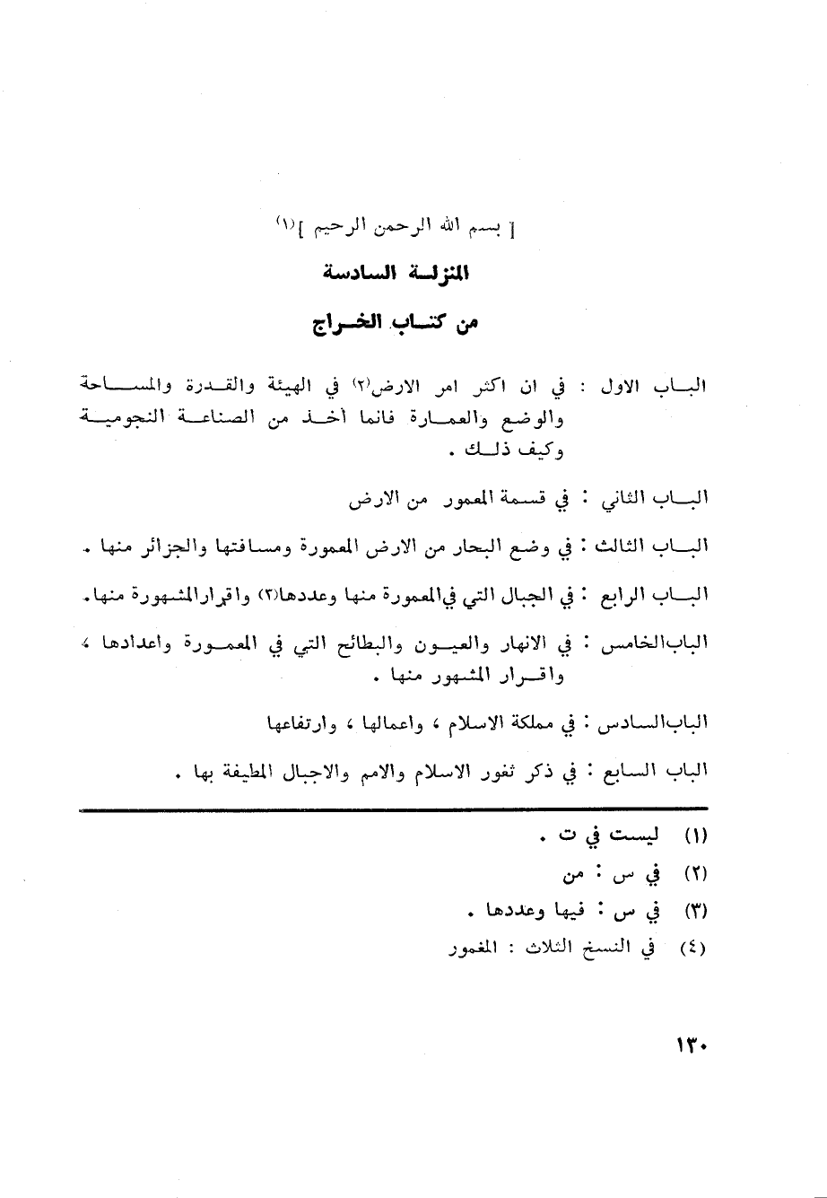 [بسم الله الرحمن الرحيم] «1» الباب الاول: في ان اكثر امر الارض «2» في الهيئة والقدرة والمساحة والوضع والعمارة فانما اخذ من الصناعة النجومية وكيف ذلك.
