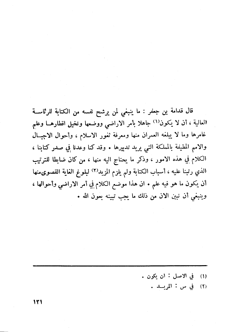 قال قدامة بن جعفر: ما ينبغي لمن يرشح نفسه من الكتابة للرئاسة العالية، أن لا يكون «1» جاهلا بأمر الاراضي ووضعها ونخيل اقطارها وعلم غامرها وما لا يبلغه العمران منها ومعرفة ثغور الاسلام، وأحوال الاجبال والامم المطيفة بالمملكة التي يريد تدبيرها. وقد كنا وعدنا في صدر كتابنا، الكلام في هذه الامور، وذكر ما يحتاج اليه منها، من كان ضابطا للترتيب الذي رتبنا عليه، أسباب الكتابة ولم يلزم المزيد «2» لبلوغ الغاية القصوى منها أن يكون ما هو فيه علم. ان هذا موضع الكلام في أمر الاراضي وأحوالها، وينبغي أن نبين الان من ذلك ما يجب تبينه بعون الله.