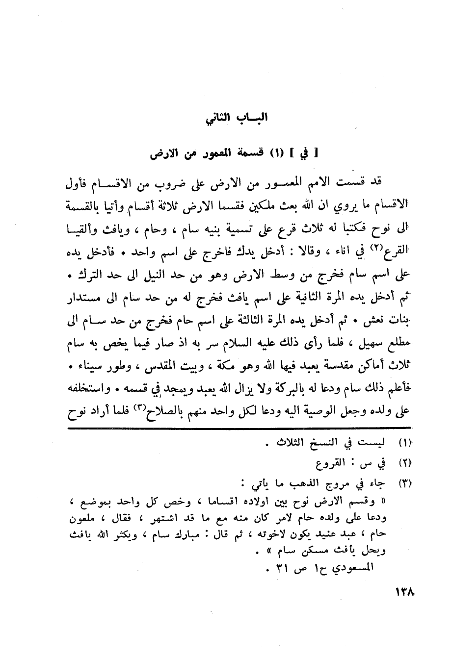 قد قسمت الامم المعمور من الارض على ضروب من الاقسام فأول الاقسام ما يروي ان الله بعث ملكين فقسما الارض ثلاثة أقسام وأتيا بالقسمة الى نوح فكتبا له ثلاث قرع على تسمية بنيه سام، وحام، ويافث وألقيا القرع «2» في اناء، وقالا: أدخل يدك فاخرج على اسم واحد. فأدخل يده على اسم سام فخرج من وسط الارض وهو من حد النيل الى حد الترك.
