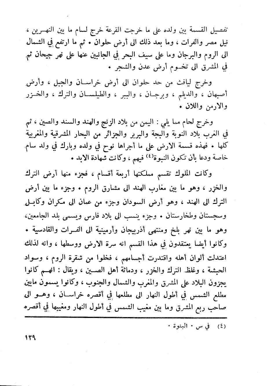 وخرج لحام مما يلي: اليمن من بلاد الزنج والهند والسند والصين، ثم في الغرب بلاد النوبة والبجة والبربر والجزائر من البحار المشرقية والمغربية كلها. فهذه قسمة الارض على ما أجراها نوح في ولده وبارك في ولد سام خاصة ودعا بأن تكون النبوة «4» فيهم، وكانت شهادة الابد.