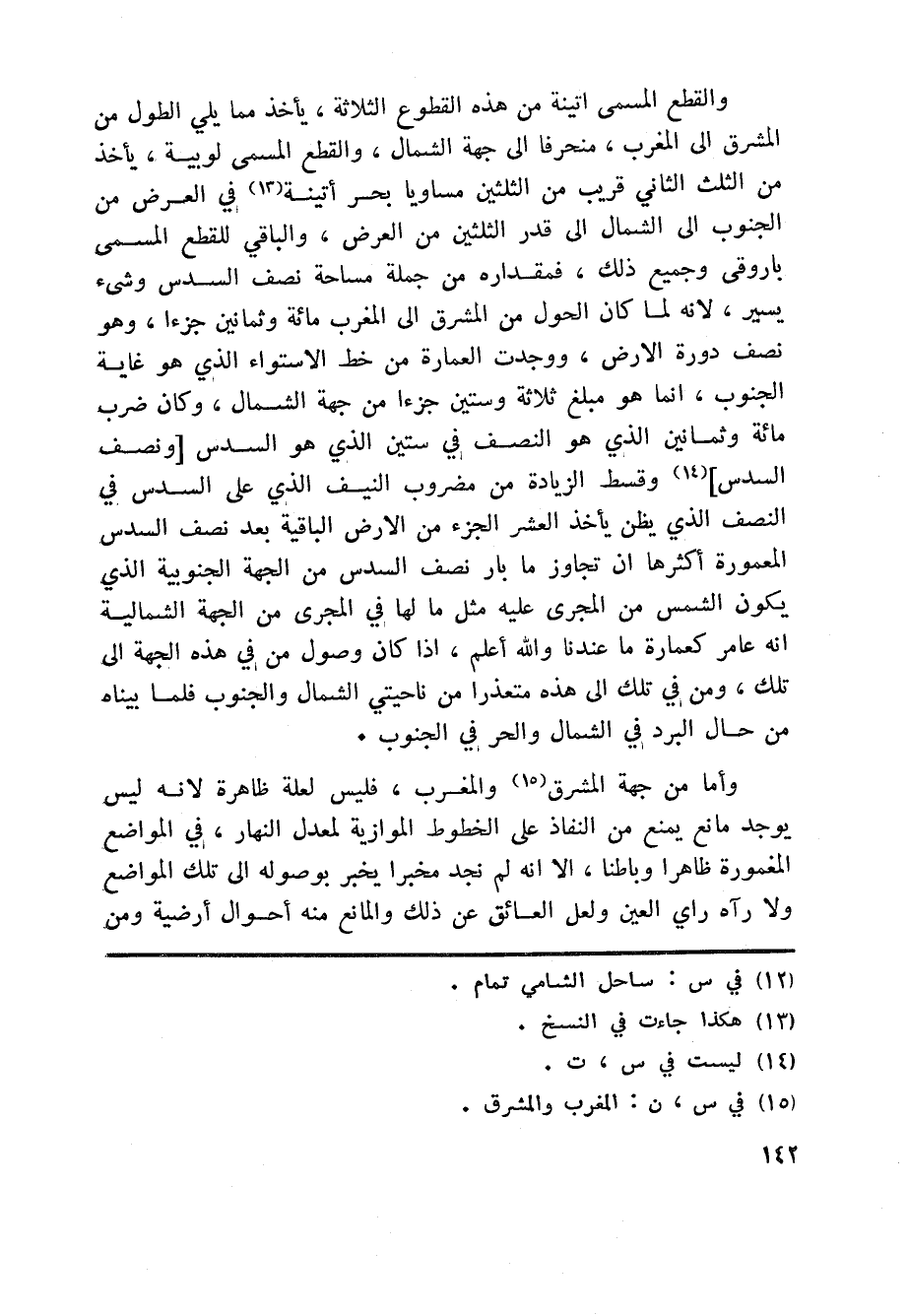 وأما من جهة المشرق «15» والمغرب، فليس لعلة ظاهرة لانه ليس يوجد مانع يمنع من النفاذ على الخطوط الموازية لمعدل النهار، في المواضع المغمورة ظاهرا وباطنا، الا انه لم نجد مخبرا يخبر بوصوله الى تلك المواضع ولا رآه راي العين ولعل العائق عن ذلك والمانع منه أحوال أرضية ومن