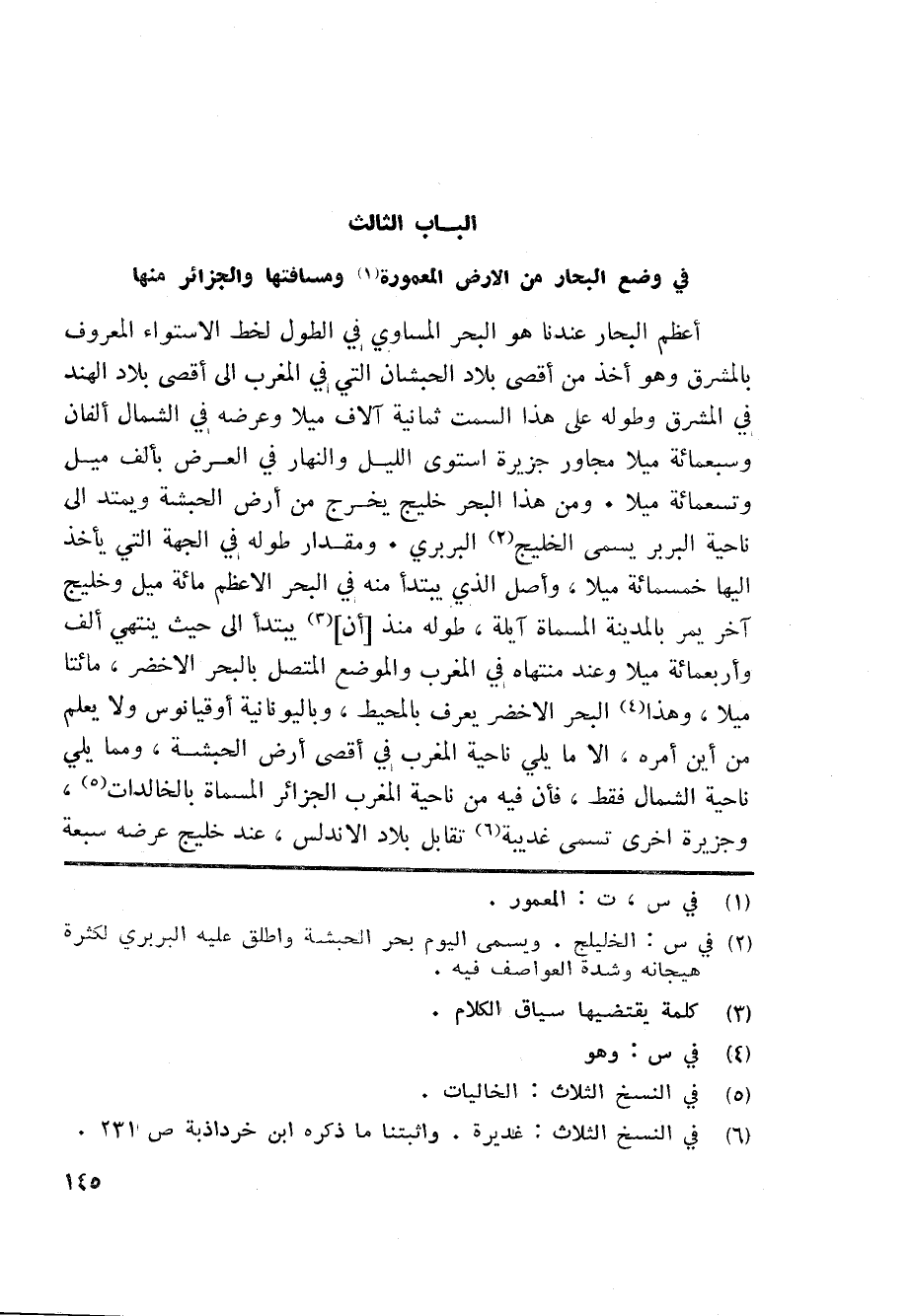 الباب الثالث في وضع البحار من الارض المعمورة «1» ومسافتها والجزائر منها