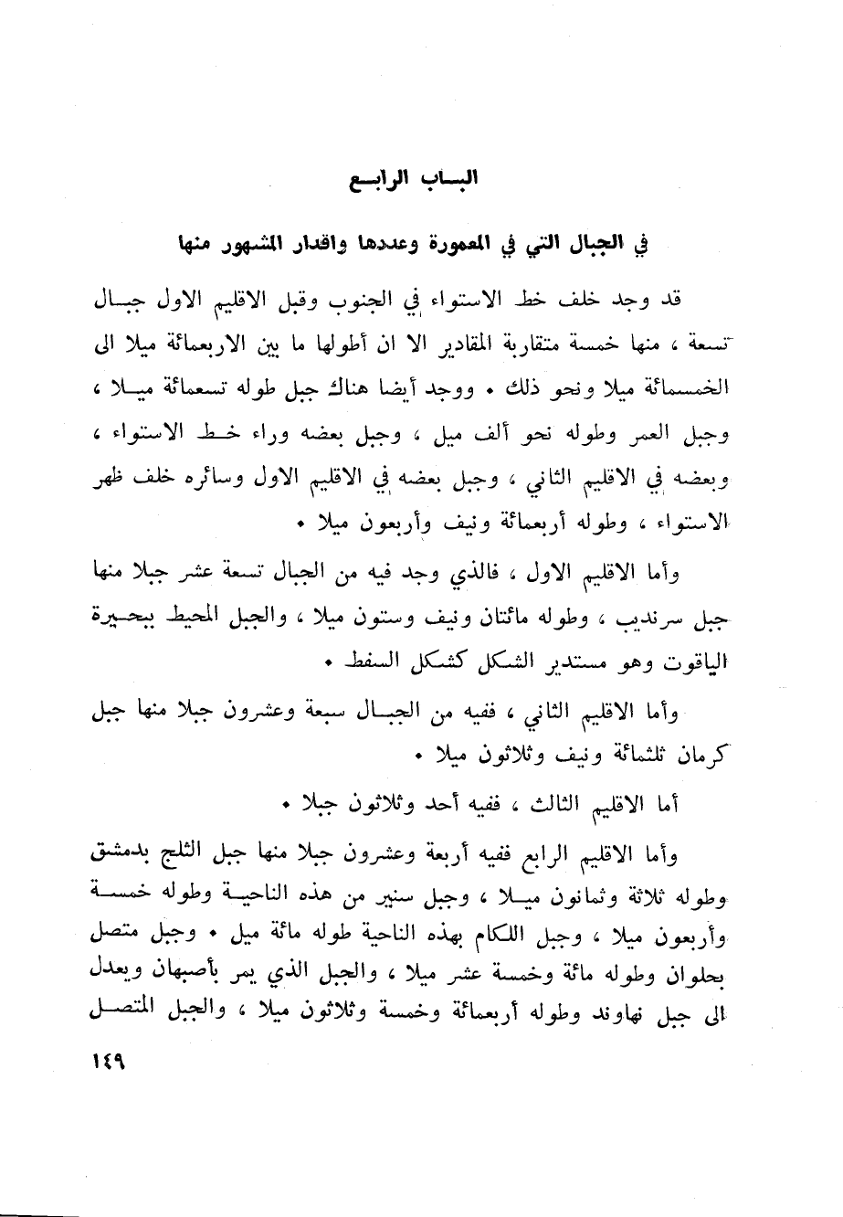وأما الاقليم الرابع ففيه أربعة وعشرون جبلا منها جبل الثلج بدمشق وطوله ثلاثة وثمانون ميلا، وجبل سنير من هذه الناحية وطوله خمسة وأربعون ميلا، وجبل اللكام بهذه الناحية طوله مائة ميل. وجبل متصل بحلوان وطوله مائة وخمسة عشر ميلا، والجبل الذي يمر بأصبهان ويعدل الى جبل نهاوند وطوله أربعمائة وخمسة وثلاثون ميلا، والجبل المتصل