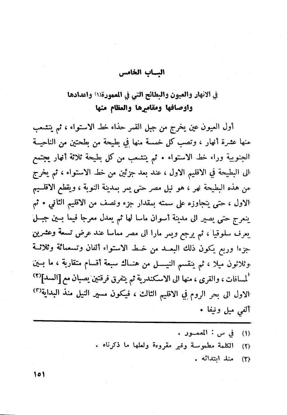 الباب الخامس في الانهار والعيون والبطائح التي في المعمورة «1» واعدادها واوصافها ومقاميرها والعظام منها