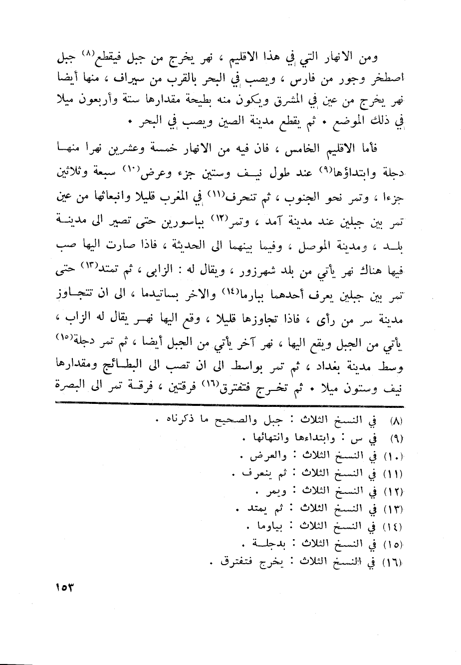 فأما الاقليم الخامس، فان فيه من الانهار خمسة وعشرين نهرا منها دجلة وابتداؤها «9» عند طول نيف وستين جزء وعرض «10» سبعة وثلاثين جزءا، وتمر نحو الجنوب، ثم تنحرف «11» في المغرب قليلا وانبعاثها من عين تمر بين جبلين عند مدينة آمد، وتمر «12» بباسورين حتى تصير الى مدينة بلد، ومدينة الموصل، وفيما بينهما الى الحديثة، فاذا صارت اليها صب فيها هناك نهر يأتي من بلد شهرزور، ويقال له: الزابى، ثم تمتد «13» حتى تمر بين جبلين يعرف أحدهما ببارما «14» والاخر بساتيدما، الى ان تتجاوز مدينة سر من رأى، فاذا تجاوزها قليلا، وقع اليها نهر يقال له الزاب، يأتي من الجبل ويقع اليها، نهر آخر يأتي من الجبل أيضا، ثم تمر دجلة «15» وسط مدينة بغداد، ثم تمر بواسط الى ان تصب الى البطائج ومقدارها نيف وستون ميلا. ثم تخرج فتفترق «16» فرقتين، فرقة تمر الى البصرة