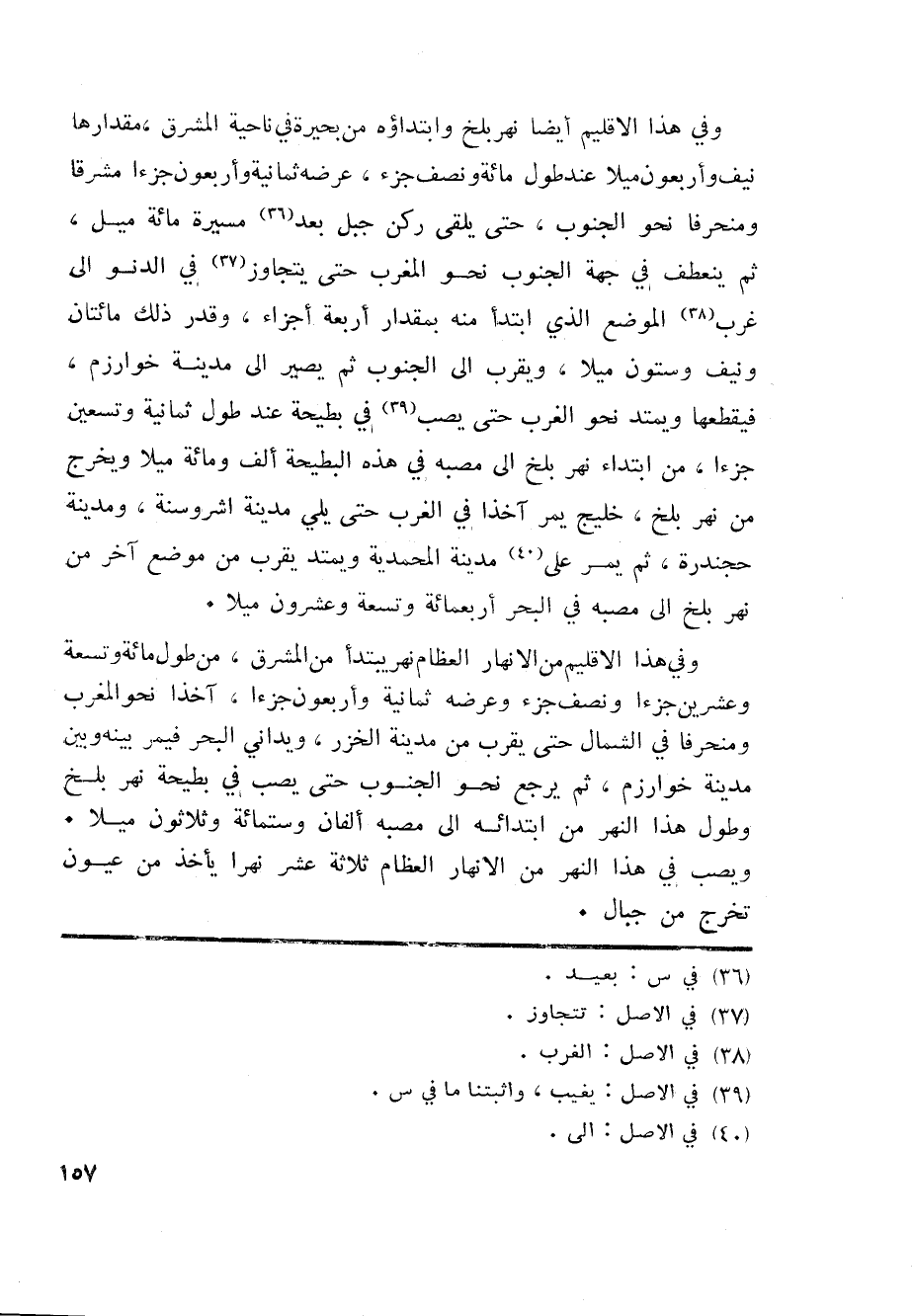 وفي هذا الاقليم أيضا نهر بلخ وابتداؤه من بحيرة في ناحية المشرق، مقدارها نيف وأربعون ميلا عند طول مائة ونصف جزء، عرضه ثمانية وأربعون جزءا مشرقا ومنحرفا نحو الجنوب، حتى يلقى ركن جبل بعد «36» مسيرة مائة ميل، ثم ينعطف في جهة الجنوب نحو المغرب حتى يتجاوز «37» في الدنو الى غرب «38» الموضع الذي ابتدأ منه بمقدار أربعة أجزاء، وقدر ذلك مائتان ونيف وستون ميلا، ويقرب الى الجنوب ثم يصير الى مدينة خوارزم، فيقطعها ويمتد نحو الغرب حتى يصب «39» في بطيحة عند طول ثمانية وتسعين جزءا، من ابتداء نهر بلخ الى مصبه في هذه البطيحة ألف ومائة ميلا ويخرج من نهر بلخ، خليج يمر آخذا في الغرب حتى يلي مدينة اشروسنة، ومدينة حجندرة، ثم يمر على «40» مدينة المحمدية ويمتد يقرب من موضع آخر من نهر بلخ الى مصبه في البحر أربعمائة وتسعة وعشرون ميلا.