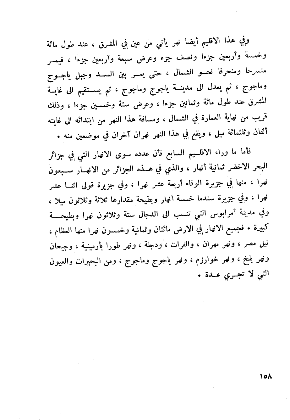 فأما ما وراء الاقليم السابع فأن عدده سوى الانهار التي في جزائر البحر الاخضر ثمانية أنهار، والذي في هذه الجزائر من الانهار سبعون نهرا، منها في جزيرة الوفاء أربعة عشر نهرا، وفي جزيرة قولى اثنا عشر نهرا، وفي جزيرة سندما خمسة أنهار وبطيحة مقدارها ثلاثة وثلاثون ميلا، وفي مدينة أمرابوس التي تنسب الى الدجال ستة وثلاثون نهرا وبطيحة كبيرة. فجميع الانهار في الارض مائتان وثمانية وخمسون نهرا منها العظام، نيل مصر، ونهر مهران، والفرات، ودجلة، ونهر طورا بأرمينية، وجيحان ونهر بلخ، ونهر خوارزم، ونهر ياجوج وماجوج، ومن البحيرات والعيون التي لا تجري عدة.