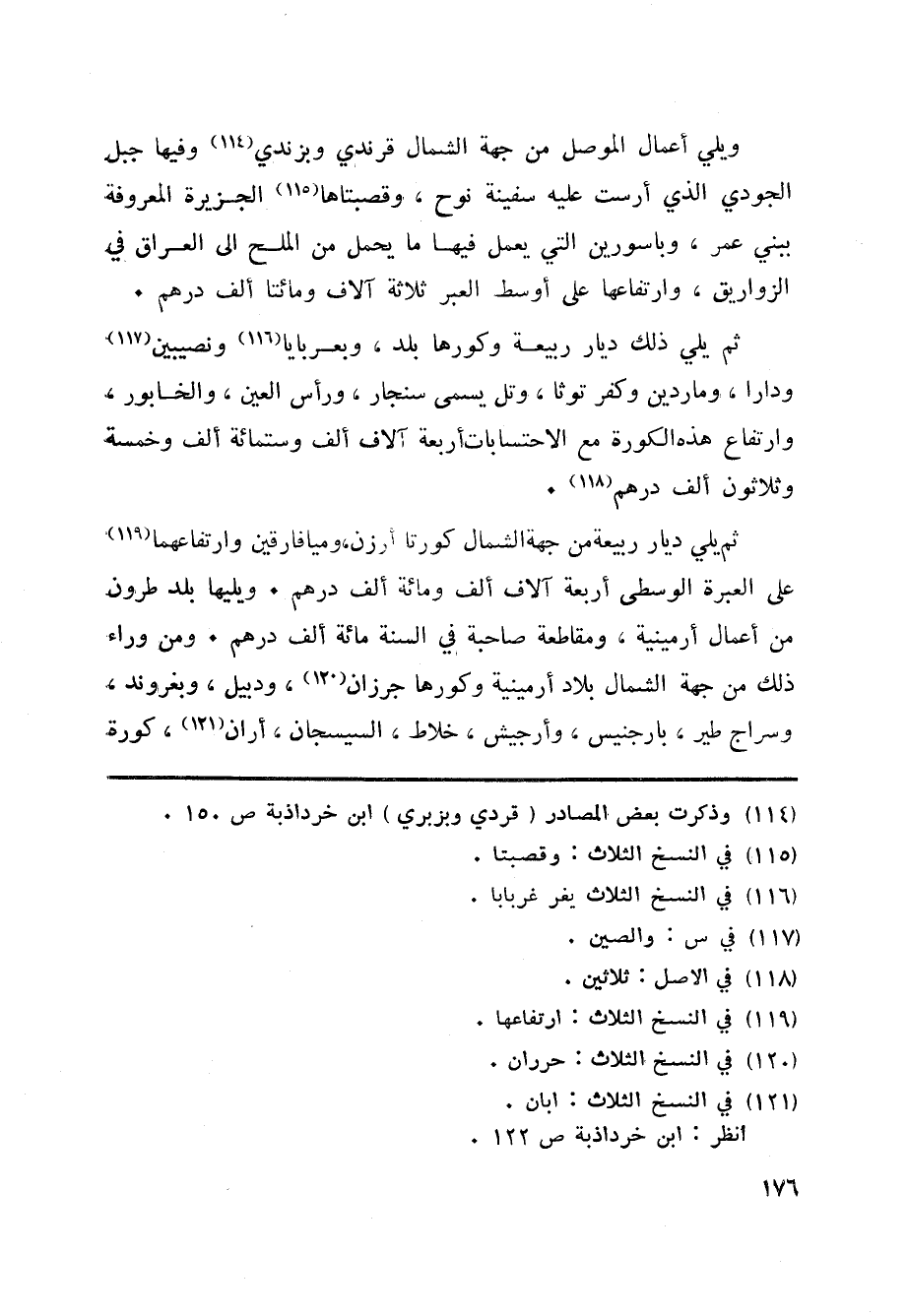 ثم يلي ذلك ديار ربيعة وكورها بلد، وبعربايا «116» ونصيبين «117» ودارا، وماردين وكفر توثا، وتل يسمى سنجار، ورأس العين، والخابور، وارتفاع هذه الكورة مع الاحتسابات أربعة آلاف ألف وستمائة ألف وخمسة وثلاثون ألف درهم «118» .