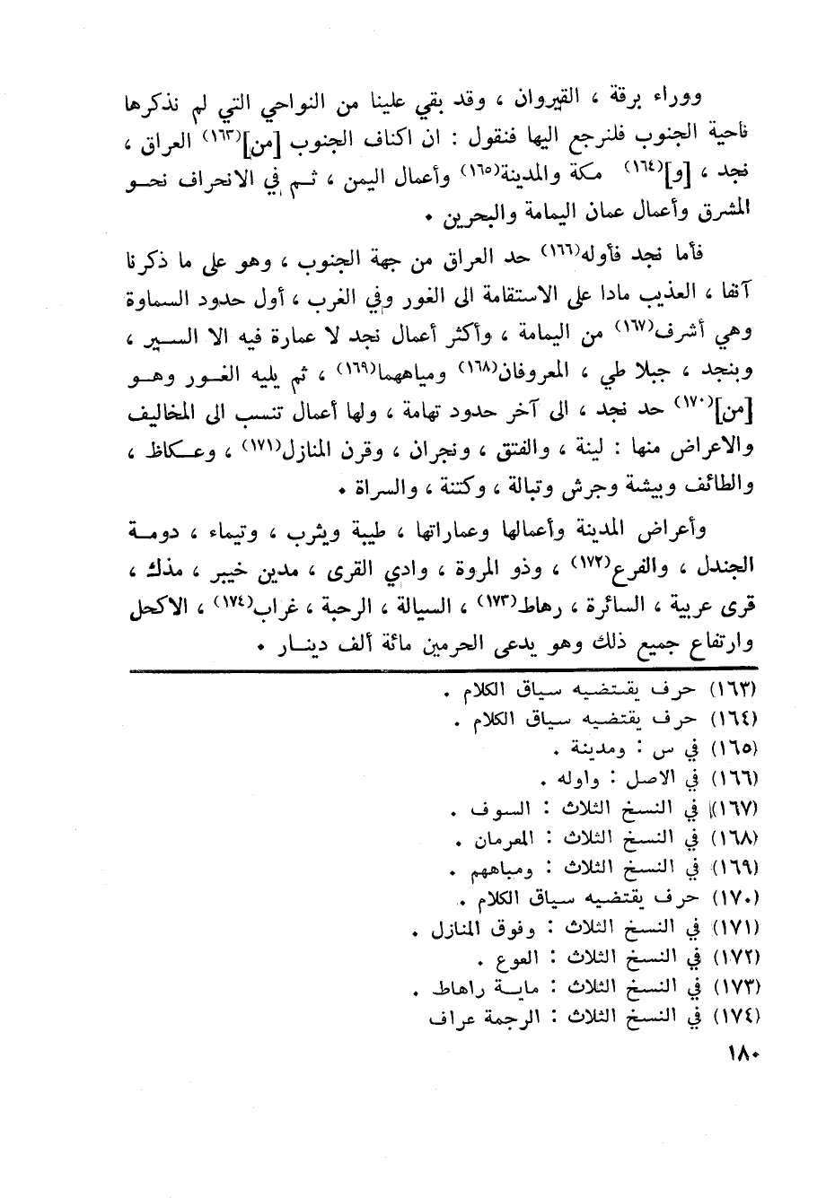 ووراء برقة، القيروان، وقد بقي علينا من النواحي التي لم نذكرها ناحية الجنوب فلنرجع اليها فنقول: ان اكناف الجنوب [من] «163» العراق، نجد، [و] «164» مكة والمدينة «165» وأعمال اليمن، ثم في الانحراف نحو المشرق وأعمال عمان اليمامة والبحرين.