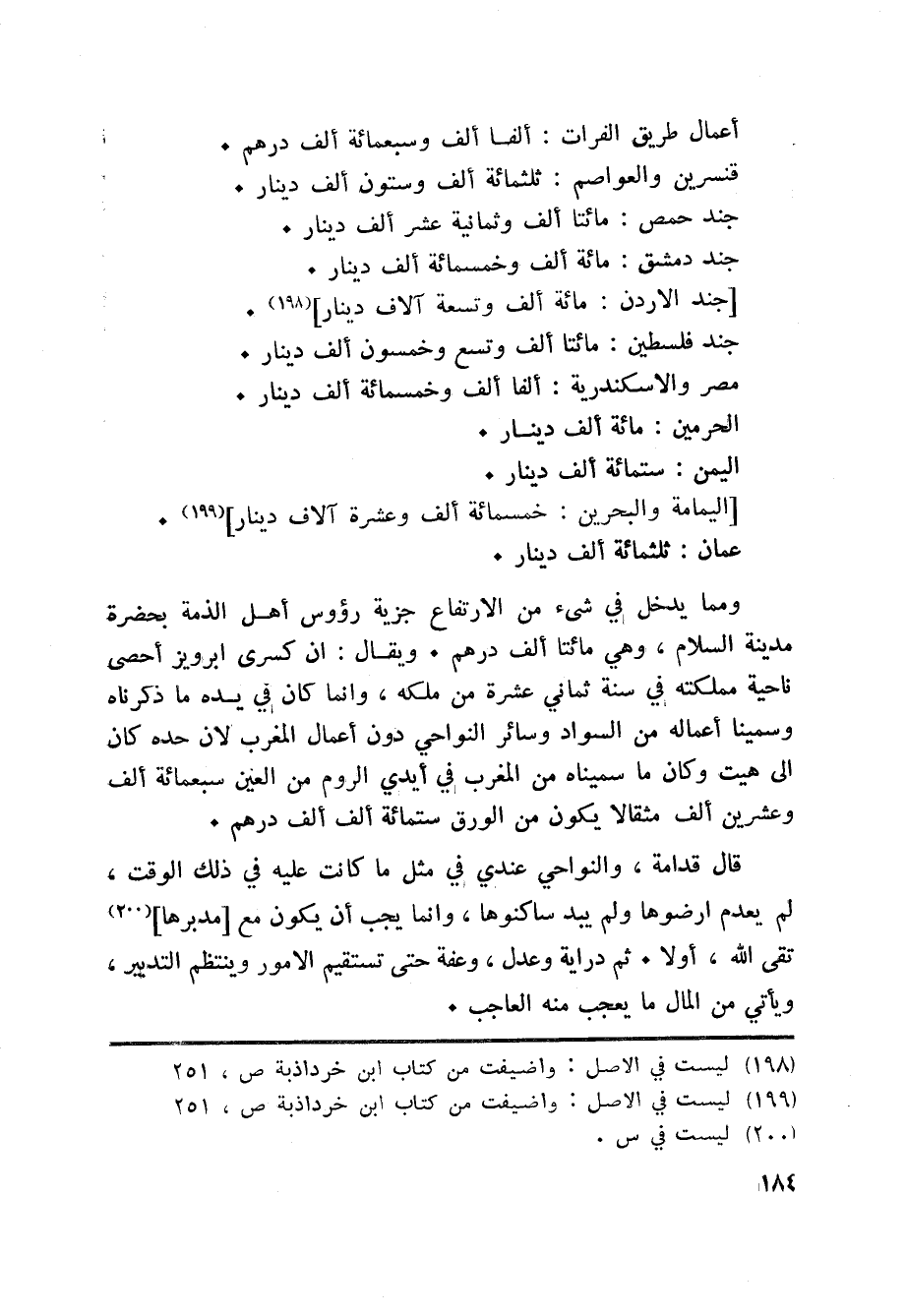 ومما يدخل في شيء من الارتفاع جزية رؤوس أهل الذمة بحضرة مدينة السلام، وهي مائتا ألف درهم. ويقال: ان كسرى ابرويز أحصى ناحية مملكته في سنة ثماني عشرة من ملكه، وانما كان في يده ما ذكرناه وسمينا أعماله من السواد وسائر النواحي دون أعمال المغرب لان حده كان الى هيت وكان ما سميناه من المغرب في أيدي الروم من العين سبعمائة ألف وعشرين ألف مثقالا يكون من الورق ستمائة ألف ألف درهم.