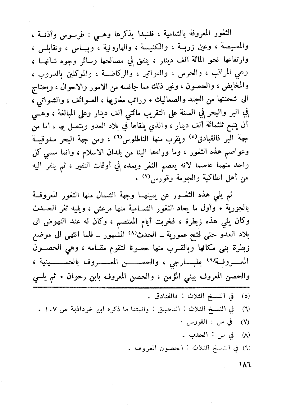 الثغور المعروفة بالشامية، فلنبدأ بذكرها وهي: طرسوس وأذنة، والمصيصة، وعين زربة، والكنيسة، والهارونية، وبياس، ونقابلس، وارتفاعها نحو المائة ألف دينار، ينفق في مصالحها وسائر وجوه شأنها، وهي المراقب، والحرس، والفواثير، والركاضة، والموكلين بالدروب، والمخايض، والحصون، وغير ذلك مما جانسه من الامور والاحوال، ويحتاج الى شحنتها من الجند والصعاليك. وراتب مغازيها، الصوائف، والشواتي، في البر والبحر في السنة على التقريب مائتي ألف دينار وعلى المبالغة، وهي أن يتبع ثلثمائة ألف دينار، والذي يلقاها في بلاد العدو ويتصل بها، أما من جهة البر فالقبادق «5» ويقرب منها الناطلوس «6» ، ومن جهة البحر سلوقية وعواصم هذه الثغور، وما وراءها الينا من بلدان الاسلام، وانما سمي كل واحد منهما عاصما لانه يعصم الثغر ويمده في أوقات النفير، ثم ينفر اليه من أهل انطاكية والجومة وقورس «7» .