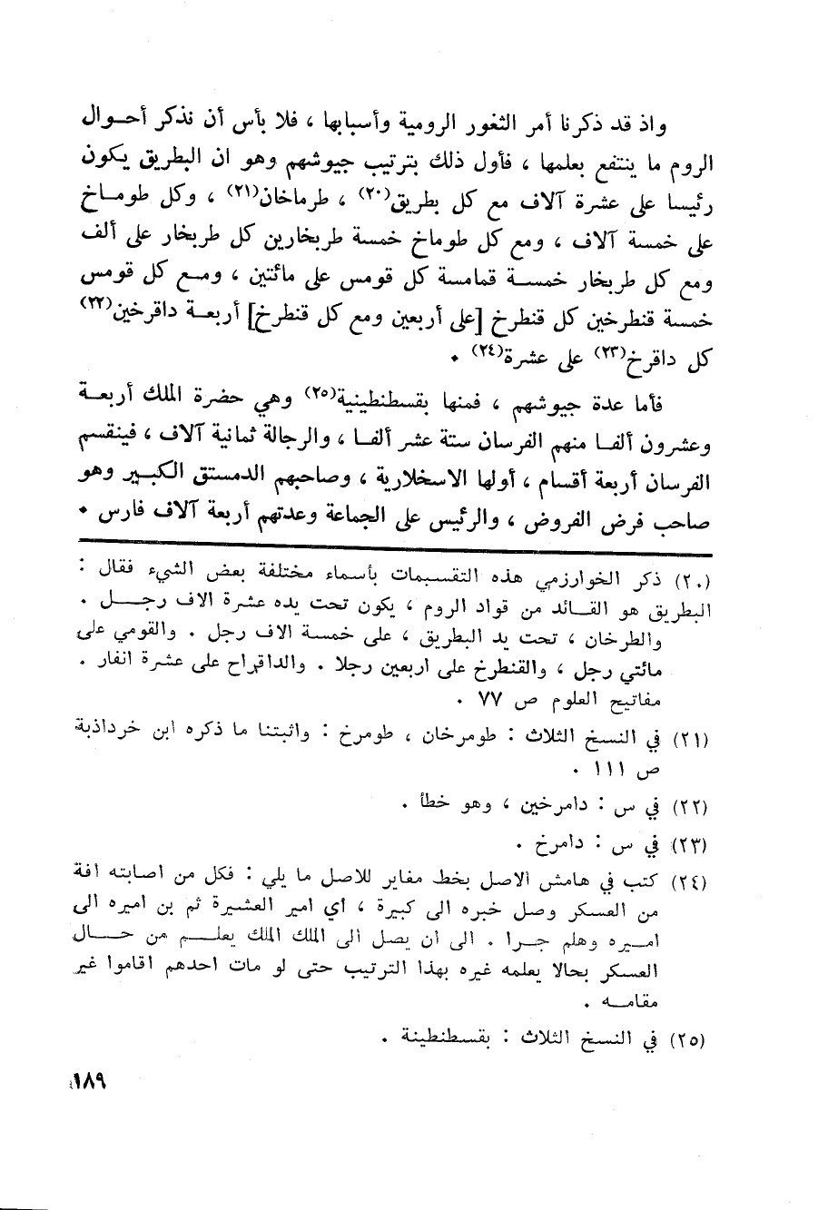 واذ قد ذكرنا أمر الثغور الرومية وأسبابها، فلا بأس أن نذكر أحوال الروم ما ينتفع بعلمها، فأول ذلك بترتيب جيوشهم وهو ان البطريق يكون رئيسا على عشرة آلاف مع كل بطريق «20» ، طرماخان «21» ، وكل طوماخ على خمسة آلاف، ومع كل طوماخ خمسة طربخارين كل طربخار على ألف ومع كل طربخار خمسة قمامسة كل قومس على مائتين، ومع كل قومس خمسة قنطرخين كل قنطرخ [على أربعين ومع كل قنطرخ] أربعة داقرخين «22» كل داقرخ «23» على عشرة «24» .