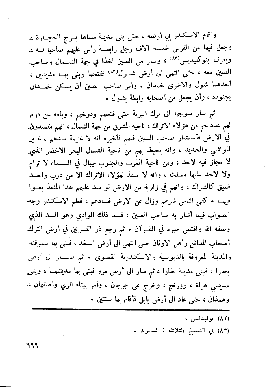 ثم سار متوجها الى ترك البرية حتى فتحهم ودوخهم، وبلغه عن قوم لهم عدد جم من هؤلاء الاتراك، ناحية المشرق من جهة الشمال، انهم مفسدون في الارض فأستشار صاحب الصين فيهم فأخبره انه لا غنيمة عندهم، غير المواشي والحديد، وانه يحيط بهم من ناحية الشمال البحر الاخضر الذي لا مجاز فيه لاحد، ومن ناحية المغرب والجنوب جبال في السماء لا ترام ولا لاحد عليها مسلك، وانه لا منفذ لهؤلاء الاتراك الا من درب واحد ضيق كالشراك، وانهم في زاوية من الارض لو سد عليهم هذا المنفذ بقوا فيها. كفى الناس شرهم وزال عن الارض فسادهم، فعلم الاسكندر وجه الصواب فيما أشار به صاحب الصين، فسد ذلك الوادي وهو السد الذي وصفه الله واقتص خبره في القرآن. ثم رجع ذو القرنين في أرض الترك أصحاب المدائن وأهل الاوثان حتى انتهى الى أرض السغد، فبنى بها سمرقند والمدينة المعروفة بالدبوسية والاسكندرية القصوى. ثم صار الى أرض بخارا، فبنى مدينة بخارا، ثم سار الى أرض مرو فبنى بها مدينتها، وبنى مدينتي هراة، وزرنج، وخرج على جرجان، وأمر ببناء الري وأصفهان، وهمذان، حتى عاد الى أرض بابل فأقام بها سنتين.