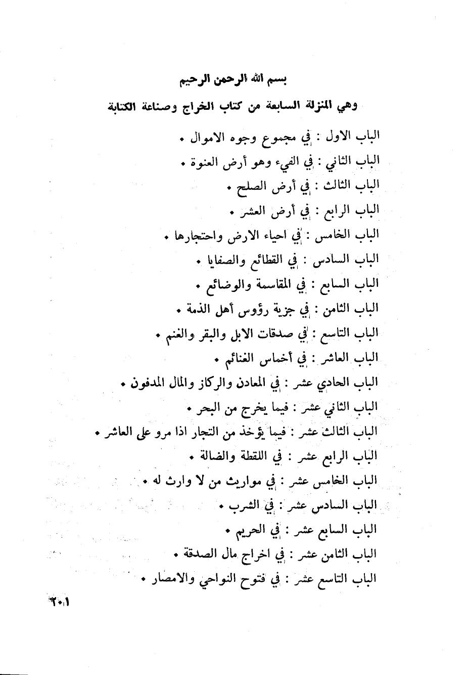 بسم الله الرّحمن الرّحيم وهي المنزلة السابعة من كتاب الخراج وصناعة الكتابة الباب الاول: في مجموع وجوه الاموال.