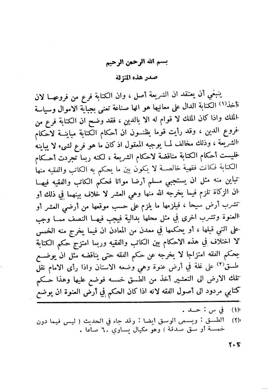 بسم الله الرّحمن الرّحيم ينبغي أن يعتقد ان الشريعة أصل، وان الكتابة فرع من فروعها لان أخذ «1» الكتابة الدال على معانيها هو انها صناعة تعنى بجباية الاموال وسياسة الملك واذا كان الملك لا قوام له الا بالدين، فقد وضح ان الكتابة فرع من فروع الدين، وقد رأيت قوما يظنون ان أحكام الكتابة مباينة لاحكام الشريعة، وذلك مخالف لما يوجبه المعقول اذ كان ما هو فرع لشيء لا يباينه فليست أحكام الكتابة مناقضة لاحكام الشريعة، لكنه ربما تجردت أحكام الكتابة فكانت فقهية خالصة لا يكون بين ما يحكم به الكاتب والفقيه منها تباين منه مثل ان يستجبي مسلم أرضا مواتا فحكم الكاتب والفقيه فيها ان الزكاة تلزم فيما يخرجه الله منها وهي العشر لا خلاف بينهما في ذلك أو تشرب أرض سيحا، فيلزمها ما يلزم على حسب موقعها من أرضي العشر أو العنوة وتشرب اخرى في مثل محلها بدالية فيجب فيها النصف مما وجب على التي قبلها، أو يحكمها في معدن من المعادن ان فيما يخرج منه الخمس لا اختلاف في هذه الاحكام بين الكاتب والفقيه وربما امتزج حكم الكتابة بحكم الفقه امتزاجا لا يخرجه عن حكم الفقه حتى يناقضه مثل ان يوضع طسق «2» على غلة في أرض عنوة وهي وضعه الاستان واذا رأى الامام نقل تلك الارض الى التعشير أخذ من الطسق خمسه فوضع عليها وهذا حكم كتابي مردود الى أصول الفقه لانه اذا كان الحكم في أرض العنوة ان يوضع