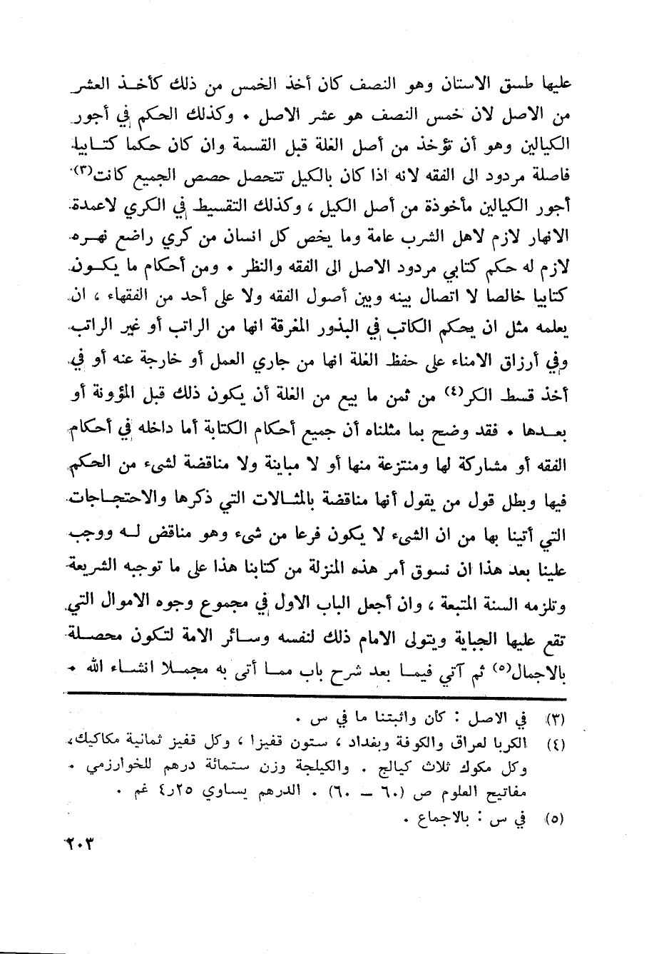 عليها طسق الاستان وهو النصف كان أخذ الخمس من ذلك كأخذ العشر من الاصل لان خمس النصف هو عشر الاصل. وكذلك الحكم في أجور الكيالين وهو أن تؤخذ من أصل الغلة قبل القسمة وان كان حكما كتابيا فاصلة مردود الى الفقه لانه اذا كان بالكيل تتحصل حصص الجميع كانت «3» أجور الكيالين مأخوذة من أصل الكيل، وكذلك التقسيط في الكري لا عمدة الانهار لازم لاهل الشرب عامة وما يخص كل انسان من كري راضع نهره لازم له حكم كتابي مردود الاصل الى الفقه والنظر. ومن أحكام ما يكون كتابيا خالصا لا اتصال بينه وبين أصول الفقه ولا على أحد من الفقهاء، ان يعلمه مثل ان يحكم الكاتب في البذور المغرقة انها من الراتب أو غير الراتب وفي أرزاق الامناء على حفظ الغلة انها من جاري العمل أو خارجة عنه أو في أخذ قسط الكر «4» من ثمن ما بيع من الغلة أن يكون ذلك قبل المؤونة أو بعدها. فقد وضح بما مثلناه أن جميع أحكام الكتابة أما داخله في أحكام الفقه أو مشاركة لها ومنتزعة منها أو لا مباينة ولا مناقضة لشيء من الحكم فيها وبطل قول من يقول أنها مناقضة بالمثالات التي ذكرها والاحتجاجات التي أتينا بها من ان الشيء لا يكون فرعا من شيء وهو مناقض له ووجب علينا بعد هذا ان نسوق أمر هذه المنزلة من كتابنا هذا على ما توجبه الشريعة وتلزمه السنة المتبعة، وان أجعل الباب الاول في مجموع وجوه الاموال التي تقع عليها الجباية ويتولى الامام ذلك لنفسه وسائر الامة لتكون محصلة بالاجمال «5» ثم آتي فيما بعد شرح باب مما أتى به مجملا إن شاء الله.