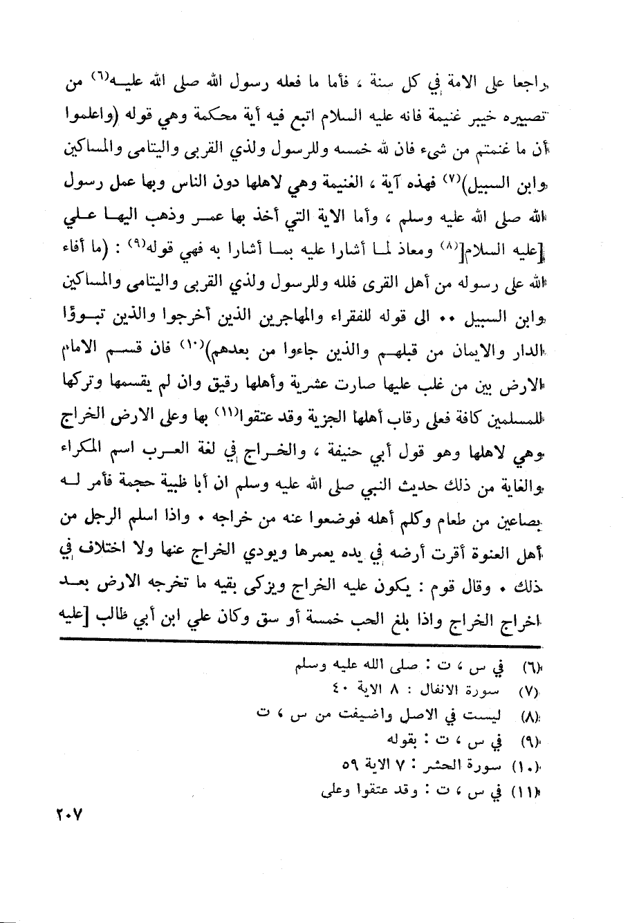 «7» فهذه آية، الغنيمة وهي لاهلها دون الناس وبها عمل رسول الله صلى الله عليه وسلم، وأما الآية التي أخذ بها عمر وذهب اليها علي [عليه السلام] [ «8» ومعاذ لما أشارا عليه بما أشارا به فهي قوله «9» : (ما أَفاءَ اللَّهُ عَلى رَسُولِهِ مِنْ أَهْلِ الْقُرى فَلِلَّهِ وَلِلرَّسُولِ وَلِذِي الْقُرْبى وَالْيَتامى وَالْمَساكِينِ وَابْنِ السَّبِيلِ..