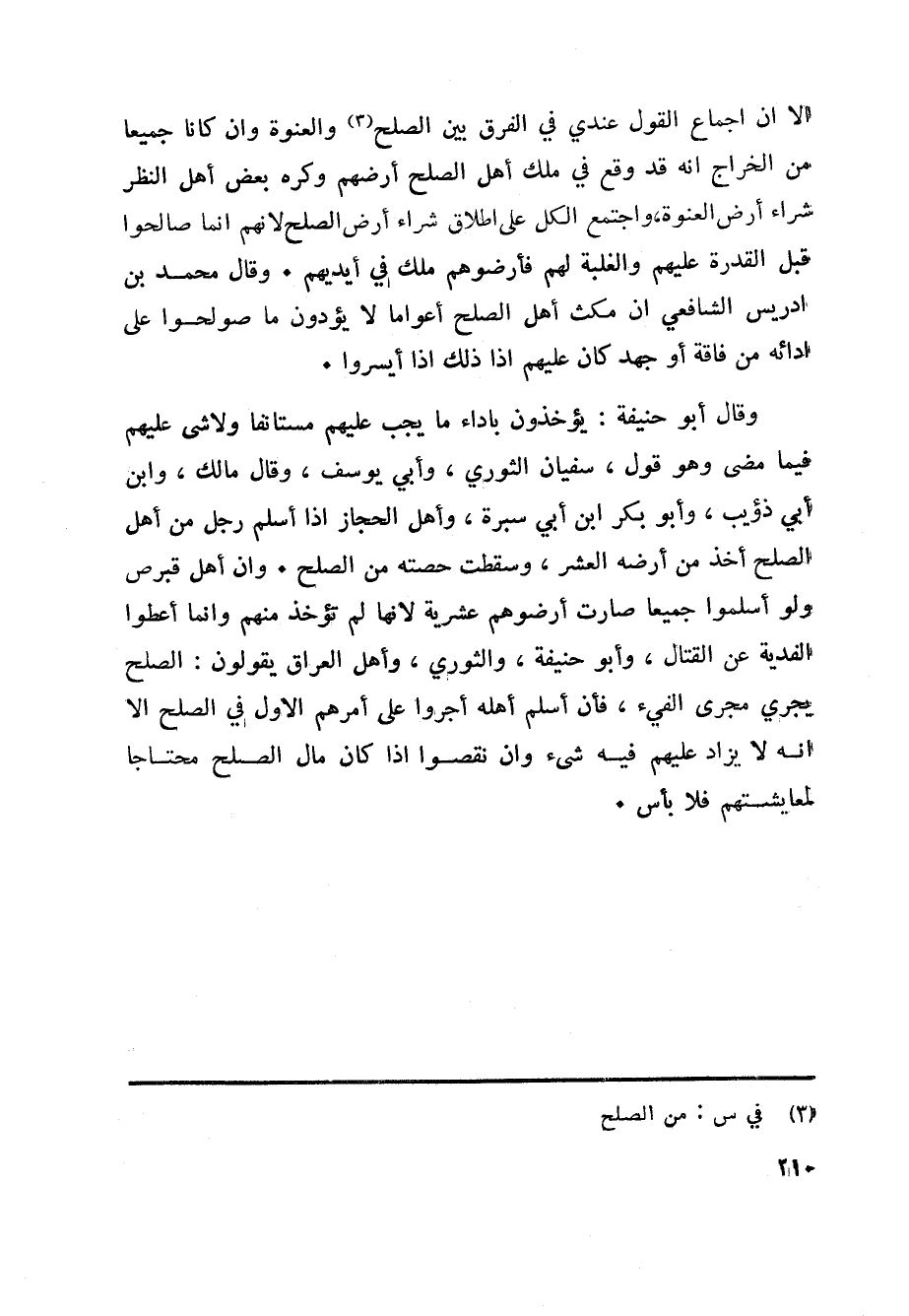 الا ان اجماع القول عندي في الفرق بين الصلح «3» والعنوة وان كانا جميعا من الخراج انه قد وقع في ملك أهل الصلح أرضهم وكره بعض أهل النظر شراء أرض العنوة، واجتمع الكل على اطلاق شراء أرض الصلح لانهم انما صالحوا قبل القدرة عليهم والغلبة لهم فأرضوهم ملك في أيديهم. وقال محمد بن ادريس الشافعي ان مكث أهل الصلح أعواما لا يؤدون ما صولحوا على ادائه من فاقة أو جهد كان عليهم اذا ذلك اذا أيسروا.