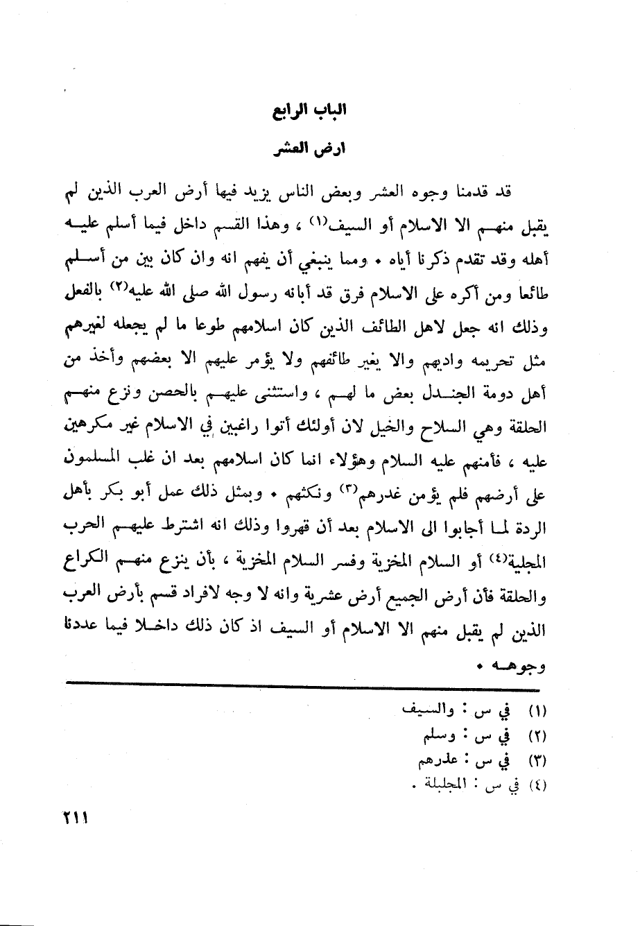 قد قدمنا وجوه العشر وبعض الناس يزيد فيها أرض العرب الذين لم يقبل منهم الا الاسلام أو السيف «1» ، وهذا القسم داخل فيما أسلم عليه أهله وقد تقدم ذكرنا أياه. ومما ينبغي أن يفهم انه وان كان بين من أسلم طائعا ومن أكره على الاسلام فرق قد أبانه رسول الله صلى الله عليه «2» بالفعل وذلك انه جعل لاهل الطائف الذين كان اسلامهم طوعا ما لم يجعله لغيرهم مثل تحريمه واديهم والا يغير طائفهم ولا يؤمر عليهم الا بعضهم وأخذ من أهل دومة الجندل بعض ما لهم، واستثنى عليهم بالحصن ونزع منهم الحلقة وهي السلاح والخيل لان أولئك أتوا راغبين في الاسلام غير مكرهين عليه، فأمنهم عليه السلام وهؤلاء انما كان اسلامهم بعد ان غلب المسلمون على أرضهم فلم يؤمن غدرهم «3» ونكثهم. وبمثل ذلك عمل أبو بكر بأهل الردة لما أجابوا الى الاسلام بعد أن قهروا وذلك انه اشترط عليهم الحرب المجلية «4» أو السلام المخزية وفسر السلام المخزية، بأن ينزع منهم الكراع والحلقة فأن أرض الجميع أرض عشرية وانه لا وجه لافراد قسم بأرض العرب الذين لم يقبل منهم الا الاسلام أو السيف اذ كان ذلك داخلا فيما عددنا وجوهه.