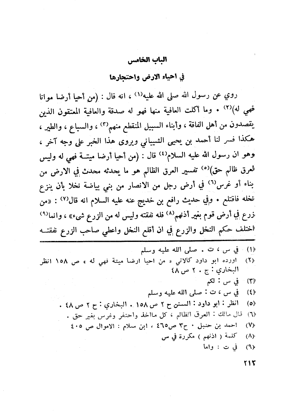 روي عن رسول الله صلى الله عليه «1» ، انه قال: (من أحيا أرضا مواتا فهي له) «2» . وما أكلت العافية منها فهو له صدقة والعافية المعتقون الذين يقصدون من أهل الفاقة، وأبناء السبيل المنقطع منهم «3» ، والسباع، والطير، هكذا فسر لنا أحمد بن يحيى الشيباني ويروى هذا الخبر على وجه آخر، وهو ان رسول الله عليه السلام «4» قال: (من أحيا أرضا ميتة فهي له وليس لعرق ظالم حق) «5» تفسير العرق الظالم هو ما يحدثه محدث في الارض من بناء أو غرس «6» في أرض رجل من الانصار من بني بياضة نخلا بأن ينزع نخله فاقتلع. وفي حديث رافع بن خديج عنه عليه السلام انه قال «7» : «من زرع في أرض قوم بغير أذنهم «8» فله نفقته وليس له من الزرع شيء» ، وانما «9» اختلف حكم النخل والزرع في ان أقلع النخل واعطي صاحب الزرع نفقته