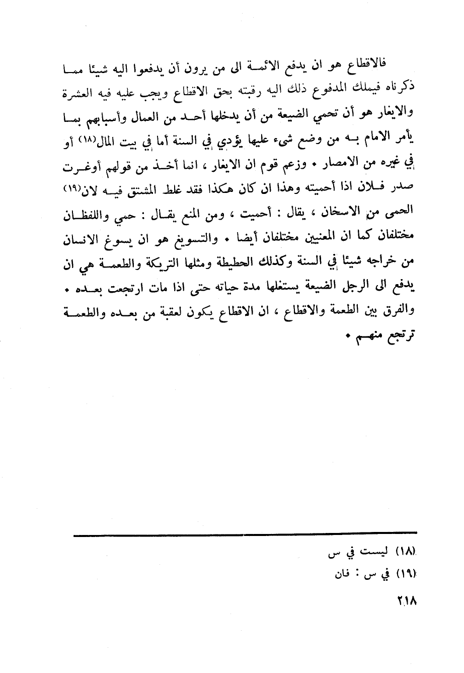 فالاقطاع هو ان يدفع الائمة الى من يرون أن يدفعوا اليه شيئا مما ذكرناه فيملك المدفوع ذلك اليه رقبته بحق الاقطاع ويجب عليه فيه العشرة والايغار هو أن تحمي الضيعة من أن يدخلها أحد من العمال وأسبابهم بما يأمر الامام به من وضع شيء عليها يؤدي في السنة أما في بيت المال «18» أو في غيره من الامصار. وزعم قوم ان الايغار، انما أخذ من قولهم أوغرت صدر فلان اذا أحميته وهذا ان كان هكذا فقد غلط المشتق فيه لان «19» الحمى من الاسخان، يقال: أحميت، ومن المنع يقال: حمي واللفظان مختلفان كما ان المعنيين مختلفان أيضا. والتسويغ هو ان يسوغ الانسان من خراجه شيئا في السنة وكذلك الحطيطة ومثلها التريكة والطعمة هي ان يدفع الى الرجل الضيعة يستغلها مدة حياته حتى اذا مات ارتجعت بعده.