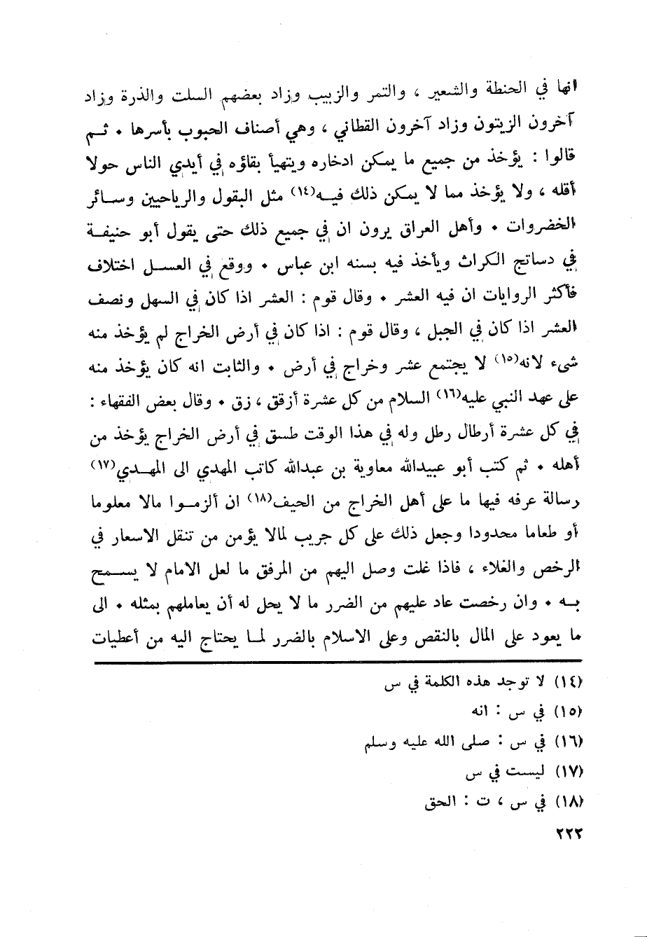 انها في الحنطة والشعير، والتمر والزبيب وزاد بعضهم السلت والذرة وزاد آخرون الزيتون وزاد آخرون القطاني، وهي أصناف الحبوب بأسرها. ثم قالوا: يؤخذ من جميع ما يمكن ادخاره ويتهيأ بقاؤه في أيدي الناس حولا أقله، ولا يؤخذ مما لا يمكن ذلك فيه «14» مثل البقول والرياحيين وسائر الخضروات. وأهل العراق يرون ان في جميع ذلك حتى يقول أبو حنيفة في دساتج الكراث ويأخذ فيه بسنه ابن عباس. ووقع في العسل اختلاف فأكثر الروايات ان فيه العشر. وقال قوم: العشر اذا كان في السهل ونصف العشر اذا كان في الجبل، وقال قوم: اذا كان في أرض الخراج لم يؤخذ منه شيء لانه «15» لا يجتمع عشر وخراج في أرض. والثابت انه كان يؤخذ منه على عهد النبي عليه «16» السلام من كل عشرة أزقق، زق. وقال بعض الفقهاء: