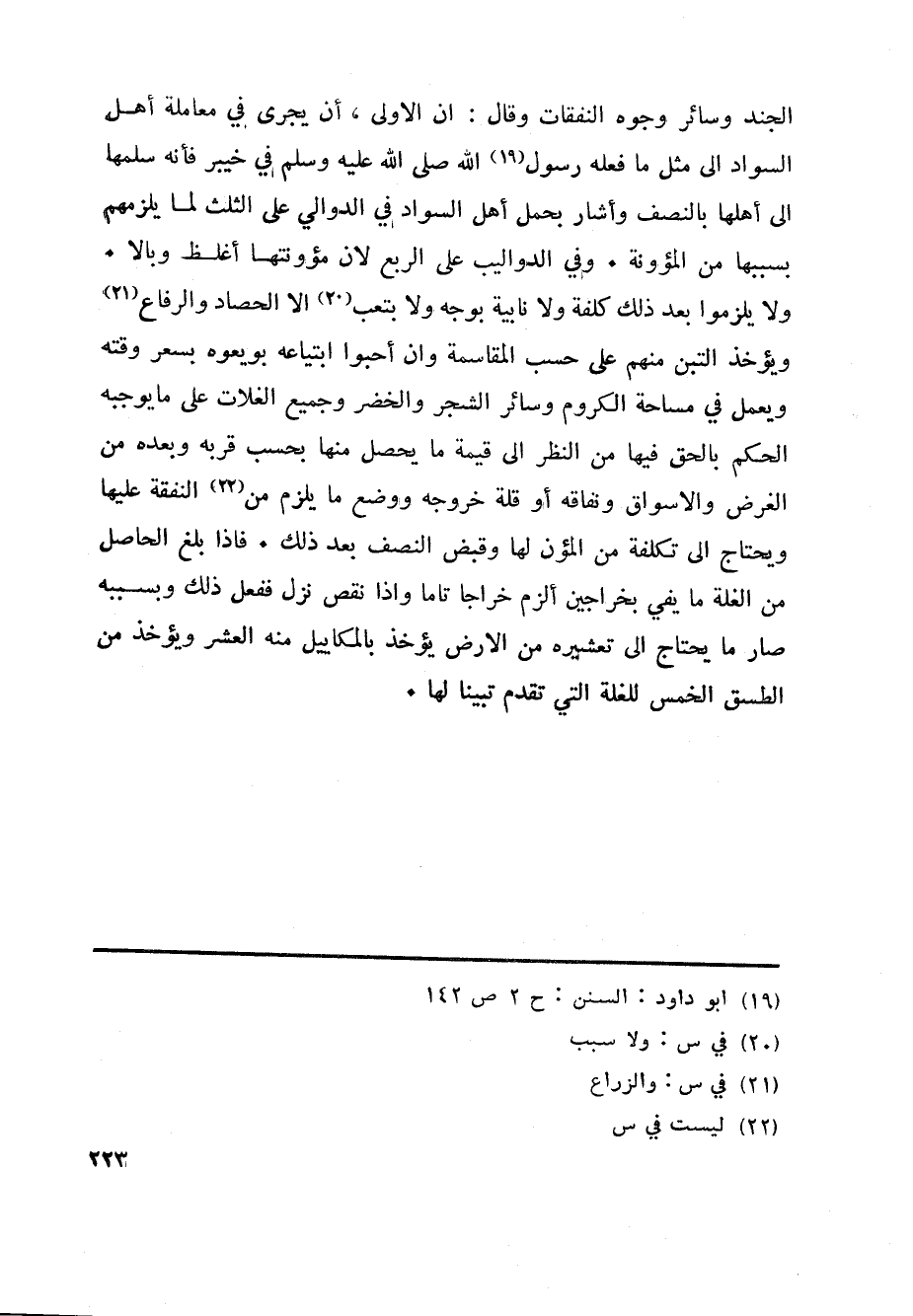 الجند وسائر وجوه النفقات وقال: ان الاولى، أن يجرى في معاملة أهل السواد الى مثل ما فعله رسول «19» الله صلى الله عليه وسلم في خيبر فأنه سلمها الى أهلها بالنصف وأشار بحمل أهل السواد في الدوالي على الثلث لما يلزمهم بسببها من المؤونة. وفي الدواليب على الربع لان مؤونتها أغلظ وبالا.
