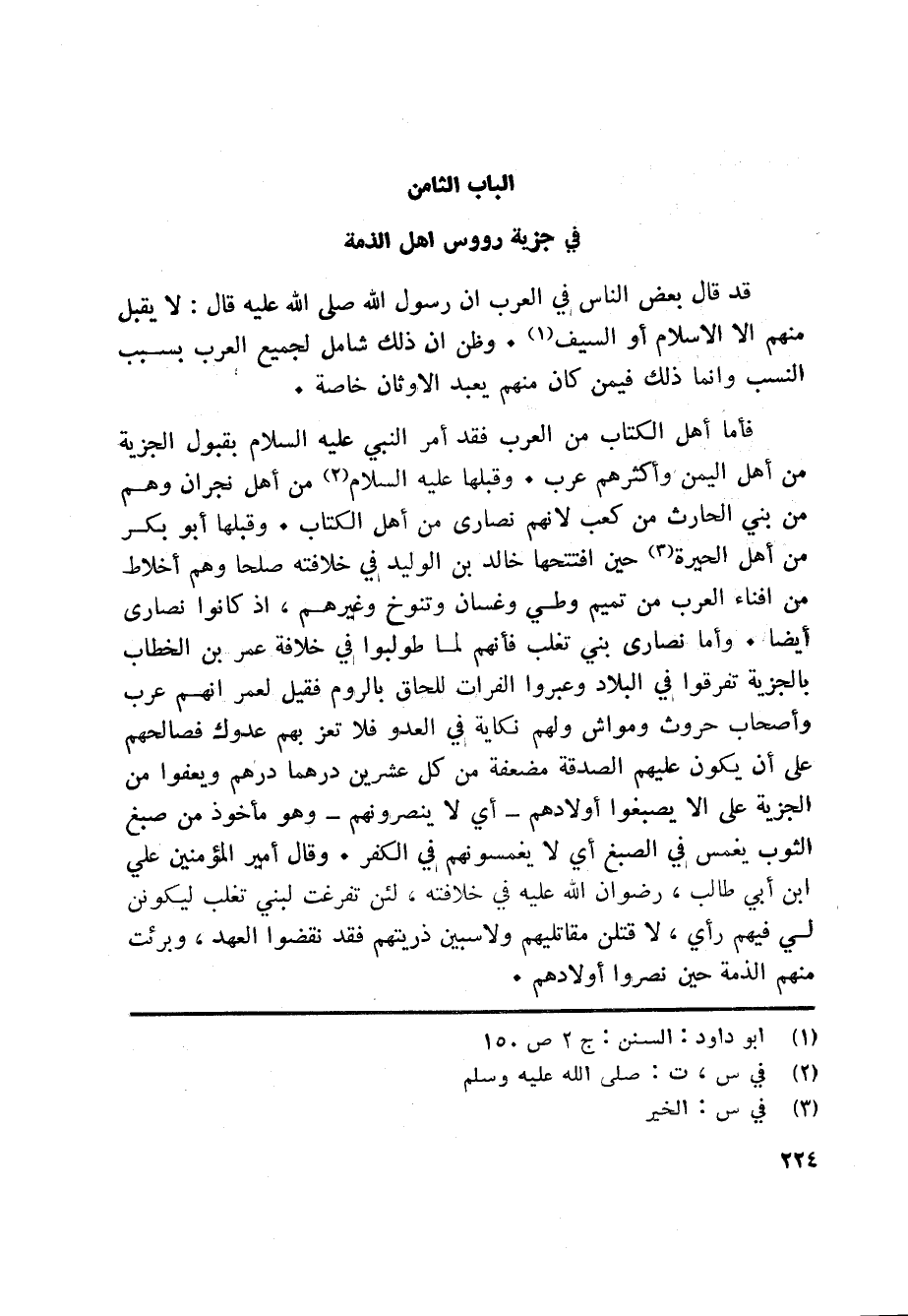 فأما أهل الكتاب من العرب فقد أمر النبي عليه السلام بقبول الجزية من أهل اليمن وأكثرهم عرب. وقبلها عليه السلام «2» من أهل نجران وهم من بني الحارث من كعب لانهم نصارى من أهل الكتاب. وقبلها أبو بكر من أهل الحيرة «3» حين افتتحها خالد بن الوليد في خلافته صلحا وهم أخلاط من افناء العرب من تميم وطي وغسان وتنوخ وغيرهم، اذ كانوا نصارى أيضا. وأما نصارى بني تغلب فأنهم لما طولبوا في خلافة عمر بن الخطاب بالجزية تفرقوا في البلاد وعبروا الفرات للحاق بالروم فقيل لعمر انهم عرب وأصحاب حروث ومواش ولهم نكاية في العدو فلا تعزبهم عدوك فصالحهم على أن يكون عليهم الصدقة مضعفة من كل عشرين درهما درهم ويعفوا من الجزية على الا يصبغوا أولادهم- أي لا ينصرونهم- وهو مأخوذ من صبغ الثوب يغمس في الصبغ أي لا يغمسونهم في الكفر. وقال أمير المؤمنين علي ابن أبي طالب، رضوان الله عليه في خلافته، لئن تفرغت لبني تغلب ليكونن لي فيهم رأي، لا قتلن مقاتليهم ولاسبين ذريتهم فقد نقضوا العهد، وبرئت منهم الذمة حين نصروا أولادهم.
