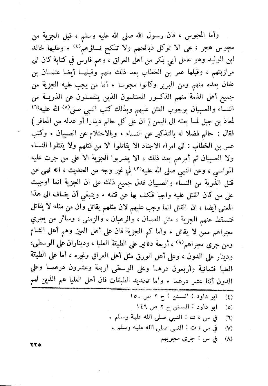 وأما المجوس، فان رسول الله صلى الله عليه وسلم، قبل الجزية من مجوس هجر، على الا توكل ذبائحهم ولا تنكح نساؤهم «4» . وطلبها خالد ابن الوليد وهو عامل أبي بكر من أهل العراق، وهم فارس في كتابة كان الى مرازبتهم، وقبلها عمر بن الخطاب بعد ذلك منهم وقبلها أيضا عثمان بن عفان بعده منهم ومن البربر وكانوا مجوسا. أما من يجب عليه الجزية من جميع أهل الذمة منهم الذكور المحتلمون الذين ينفصلون عن الذرية من النساء والصبيان بوجوب القتل عليهم وبذلك كتب النبي صلى «5» الله عليه «6» لمعاذ بن جبل لما بعثه الى اليمن (ان على كل حالم دينارا أو عدله من المعافر) فقال: حالم فضلا له بالتذكير عن النساء. وبالاحتلام عن الصبيان. وكتب عمر بن الخطاب: الى امراء الاجناد الا يقاتلوا الا من قتلهم ولا يقتلوا النساء ولا الصبيان ثم أمرهم بعد ذلك، الا يضربوا الجزية الا على من جرت عليه المواسي، وعن النبي صلى الله عليه «7» في غير وجه من الحديث، انه نهى عن قتل الذرية من النساء والصبيان فدل جميع ذلك على ان الجزية انما أوجبت على من كان القتل عليه واجبا فكف بها عن قتله. وينبغي أن يضاف الى هذا المعنى أيضا، ان القتل انما وجب عليهم لان مثلهم يقاتل وان من مثله لا يقاتل فتسقط عنهم الجزية، مثل العميان، والرهبان، والزمنى، وسائر من يجري مجراهم ممن لا يقاتل. وأما كم الجزية فان على أهل العين وهم أهل الشام ومن جرى مجراهم «8» ، أربعة دنانير على الطبقة العليا، وديناران على الوسطى، ودينار على الدون، وعلى أهل الورق مثل أهل العراق وغيره، أما على الطبقة العليا فثمانية وأربعون درهما وعلى الوسطى أربعة وعشرون درهما وعلى الدون اثنا عشر درهما. وأما تحديد الطبقات فان أهل العليا هم الذين لهم