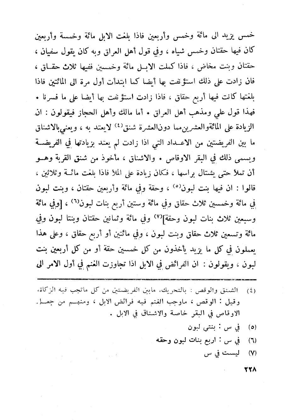 فهذا قول علي ومذهب أهل العراق. أما مالك وأهل الحجاز فيقولون: ان الزيادة على المائة والعشرين مما دون العشرة شنق «4» لا يعتد به، ويعني بالاشناق ما بين الفريضتين من الاعداد التي اذا زادت لم يعتد بزيادتها في الفريضة ويسمى ذلك في البقر الاوقاص. والاشناق، مأخوذ من شنق القربة وهو أن تملأ حتى يشتال براسها، فكان زيادة على الملأ فاذا بلغت مائة وثلاثين، قالوا: ان فيها بنت لبون «5» ، وحقة وفي مائة وأربعين حقتان، وبنت لبون في مائة وخمسين ثلاث حقاق وفي مائة وستين أربع بنات لبون «6» ، [وفي مائة وسبعين ثلاث بنات لبون وحقة] «7» وفي مائة وثمانين حقتان وبنتا لبون وفي مائة وتسعين ثلاث حقاق وبنت لبون، وفي مائتين أو أربع حقاق، وعلى هذا يعملون في كل ما يزيد يأخذون من كل خمسين حقة أو من كل أربعين بنت لبون، ويقولون: ان الفرائض في الابل اذا تجاوزت الغنم في أول الامر الى