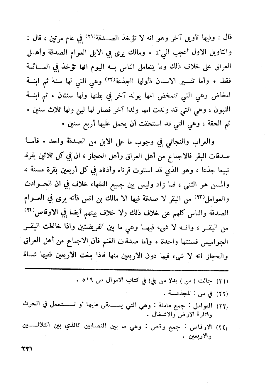 والعراب والنجاتي في وجوب ما على الابل من الصدقة واحد. فأما صدقات البقر فالاجماع من أهل العراق وأهل الحجاز، ان في كل ثلاثين بقرة تبيعا جذعا، وهو الذي قد استوت قرناه وأذناه في كل أربعين بقرة مسنة، والمسن هو الثنى، فما زاد وليس بين جميع الفقهاء خلاف في ان الحوادث والعوامل «23» من البقر لا صدقة فيها الا مالك بن انس فأنه يرى في العوام الصدقة والناس كلهم على خلاف ذلك ولا خلاف بينهم أيضا في الاوقاص «24» من البقر، وانه لا شيء فيها وهي ما بين الفريضتين واذا خالطت البقر الجواميس فسنتها واحدة. وأما صدقات الغنم فأن الاجماع من أهل العراق والحجاز انه لا شيء فيها دون الاربعين منها فاذا بلغت الاربعين ففيها شاة