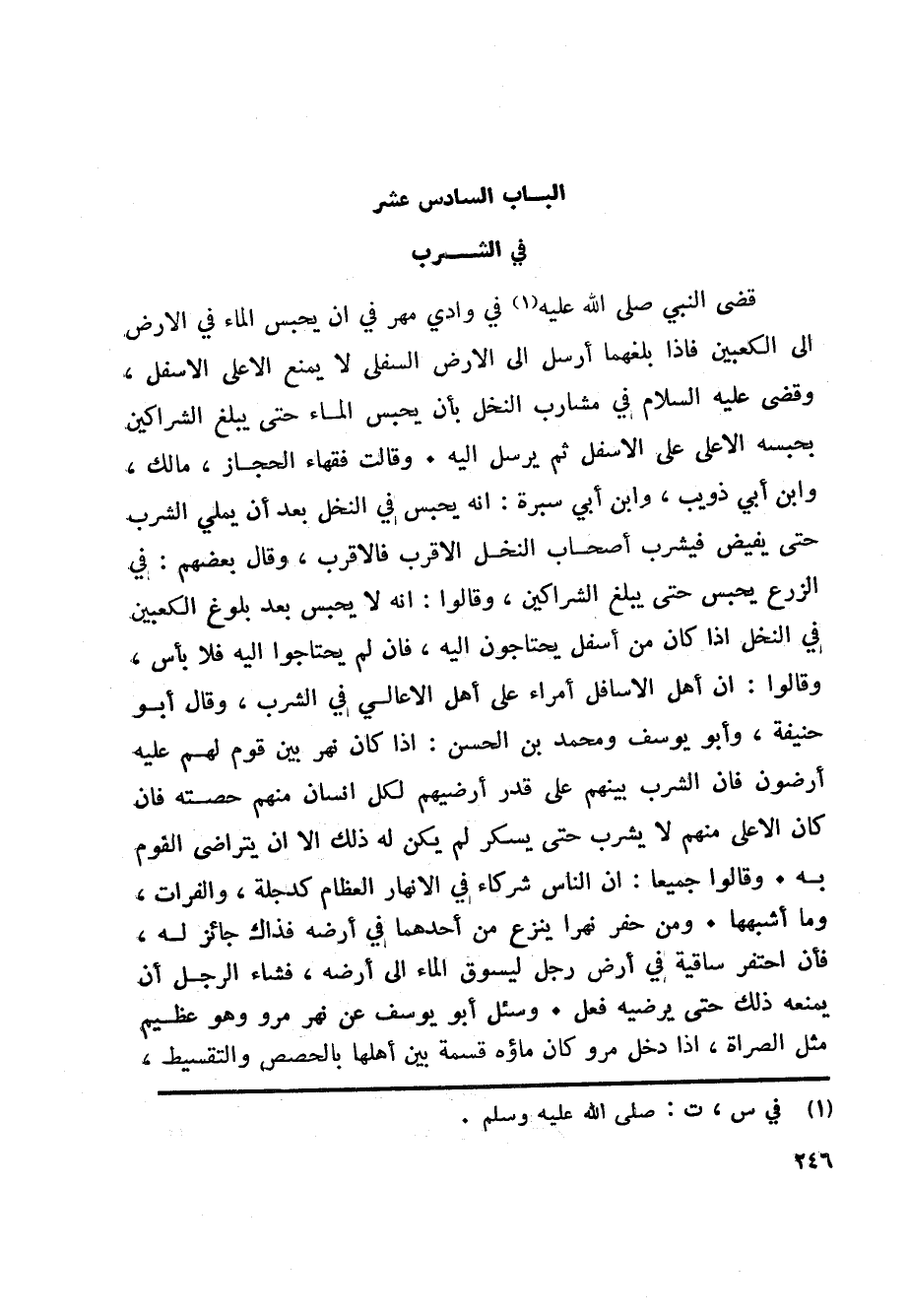 قضى النبي صلى الله عليه «1» في وادي مهر في ان يحبس الماء في الارض الى الكعبين فاذا بلغهما أرسل الى الارض السفلى لا يمنع الاعلى الاسفل، وقضى عليه السلام في مشارب النخل بأن يحبس الماء حتى يبلغ الشراكين بحبسه الاعلى على الاسفل ثم يرسل اليه. وقالت فقهاء الحجاز، مالك، وابن أبي ذويب، وابن أبي سبرة: انه يحبس في النخل بعد أن يملي الشرب حتى يفيض فيشرب أصحاب النخل الاقرب فالاقرب، وقال بعضهم: في الزرع يحبس حتى يبلغ الشراكين، وقالوا: انه لا يحبس بعد بلوغ الكعبين في النخل اذا كان من أسفل يحتاجون اليه، فان لم يحتاجوا اليه فلا بأس، وقالوا: ان أهل الاسافل أمراء على أهل الاعالي في الشرب، وقال أبو حنيفة، وأبو يوسف ومحمد بن الحسن: اذا كان نهر بين قوم لهم عليه أرضون فان الشرب بينهم على قدر أرضيهم لكل انسان منهم حصته فان كان الاعلى منهم لا يشرب حتى يسكر لم يكن له ذلك الا ان يتراضى القوم به. وقالوا جميعا: ان الناس شركاء في الانهار العظام كدجلة، والفرات، وما أشبهها. ومن حفر نهرا ينزع من أحدهما في أرضه فذاك جائز له، فأن احتفر ساقية في أرض رجل ليسوق الماء الى أرضه، فشاء الرجل أن يمنعه ذلك حتى يرضيه فعل. وسئل أبو يوسف عن نهر مرو وهو عظيم مثل الصراة، اذا دخل مرو كان ماؤه قسمة بين أهلها بالحصص والتقسيط،