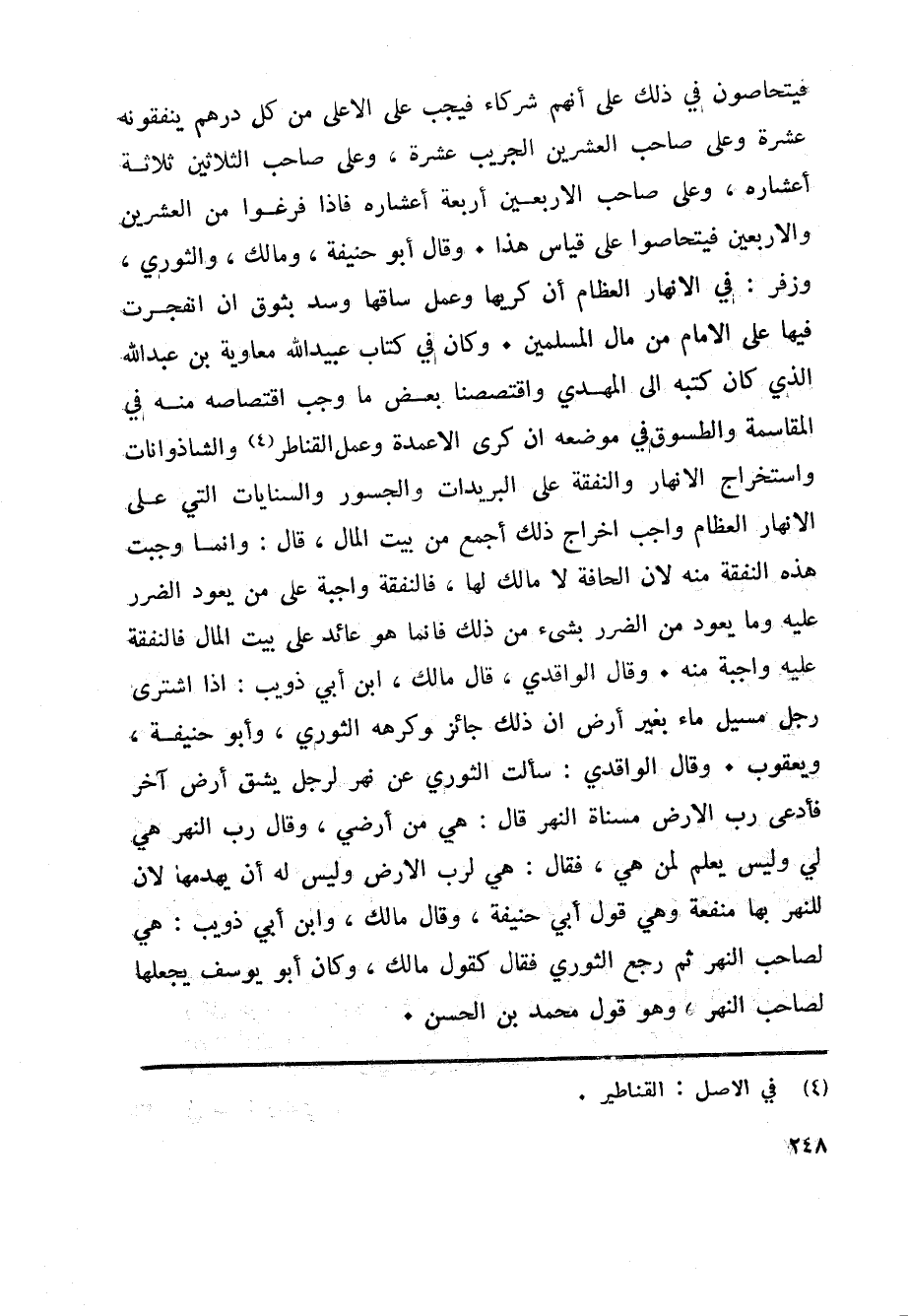 فيتحاصون في ذلك على أنهم شركاء فيجب على الاعلى من كل درهم ينفقونه عشرة وعلى صاحب العشرين الجريب عشرة، وعلى صاحب الثلاثين ثلاثة أعشاره، وعلى صاحب الاربعين أربعة أعشاره فاذا فرغوا من العشرين والاربعين فيتحاصوا على قياس هذا. وقال أبو حنيفة، ومالك، والثوري، وزفر: في الانهار العظام أن كريها وعمل ساقها وسد بثوق ان انفجرت فيها على الامام من مال المسلمين. وكان في كتاب عبيد الله معاوية بن عبد الله الذي كان كتبه الى المهدي واقتصصنا بعض ما وجب اقتصاصه منه في المقاسمة والطسوق في موضعه ان كرى الاعمدة وعمل القناطر «4» والشاذوانات واستخراج الانهار والنفقة على البريدات والجسور والسنايات التي على الانهار العظام واجب اخراج ذلك أجمع من بيت المال، قال: وانما وجبت هذه النفقة منه لان الحافة لا مالك لها، فالنفقة واجبة على من يعود الضرر عليه وما يعود من الضرر بشيء من ذلك فانما هو عائد على بيت المال فالنفقة عليه واجبة منه. وقال الواقدي، قال مالك، ابن أبي ذويب: اذا اشترى رجل مسيل ماء بغير أرض ان ذلك جائز وكرهه الثوري، وأبو حنيفة، ويعقوب. وقال الواقدي: سألت الثوري عن نهر لرجل يشق أرض آخر فأدعى رب الارض مسناة النهر قال: هي من أرضي، وقال رب النهر هي لي وليس يعلم لمن هي، فقال: هي لرب الارض وليس له أن يهدمها لان للنهر بها منفعة وهي قول أبي حنيفة، وقال مالك، وابن أبي ذويب: هي لصاحب النهر ثم رجع الثوري فقال كقول مالك، وكان أبو يوسف يجعلها لصاحب النهر، وهو قول محمد بن الحسن.