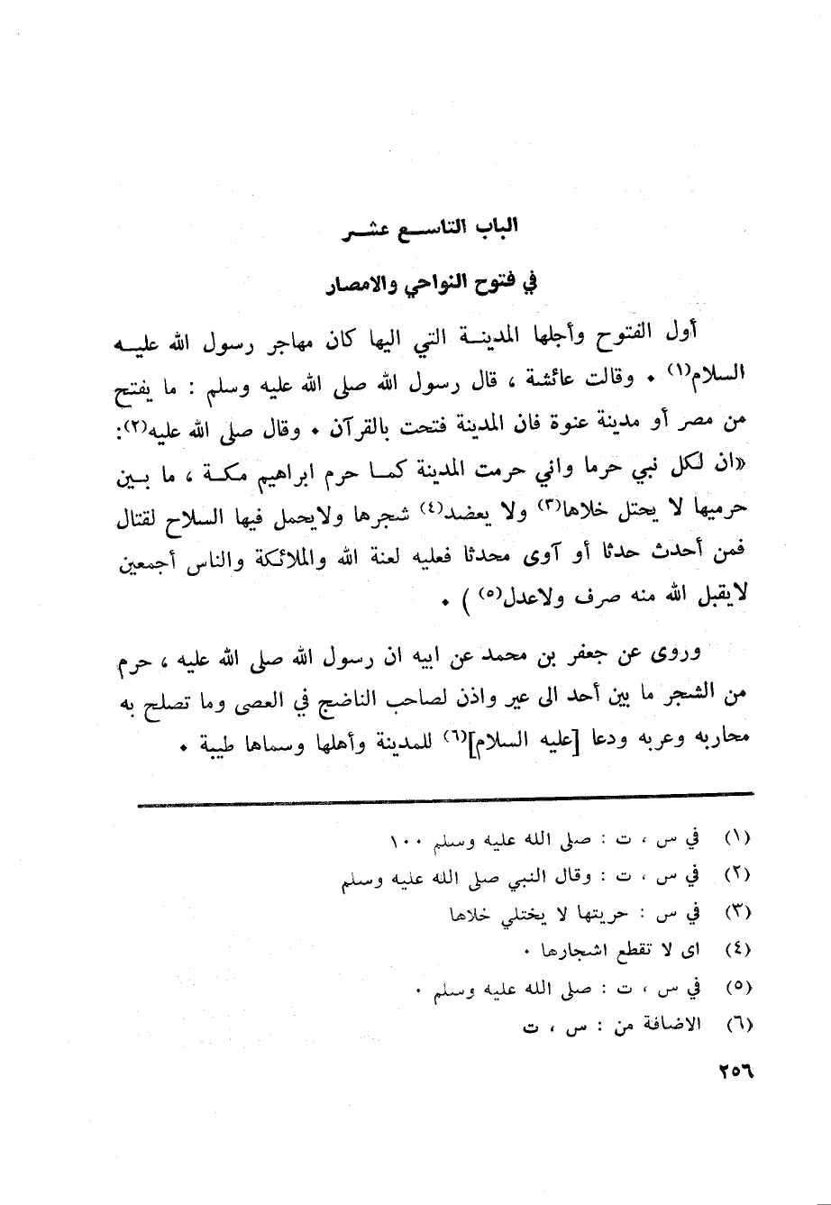 «ان لكل نبي حرما واني حرمت المدينة كما حرم ابراهيم مكة، ما بين حرميها لا يحتل خلاها «3» ولا يعضد «4» شجرها ولا يحمل فيها السلاح لقتال فمن أحدث حدثا أو آوى محدثا فعليه لعنة الله والملائكة والناس أجمعين لا يقبل الله منه صرف ولا عدل «5» ) .