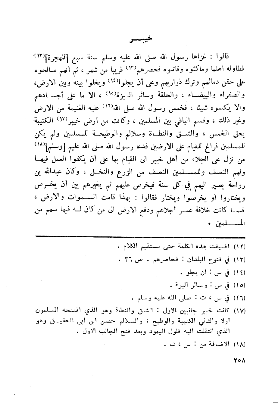 قالوا: غزاها رسول الله صلى الله عليه وسلم سنة سبع [للهجرة] «12» فطاوله أهلها وماكثوه وقاتلوه فحصرهم «13» قريبا من شهر، ثم أنهم صالحوه على حقن دمائهم وترك ذراريهم وعلى أن يجلوا «14» ويخلوا بينه وبين الارض، والصفراء والبيضاء، والحلقة وسائر البزة «15» ، الا ما على أجسادهم والا يكتموه شيئا، فخمس رسول الله صلى الله «16» عليه الغنيمة من الارض وغير ذلك، وقسم الباقي بين المسلمين، وكانت من أرض خيبر «17» الكتيبة بحق الخمس، والشق والنطاة وسلالم والوطيحة للمسلمين ولم يكن للمسلمين فراغ للقيام على الارضين فدعا رسول الله صلى الله عليه [وسلم] «18» من نزل على الجلاء من أهل خيبر الى القيام بها على أن يكفوا العمل فيها ولهم النصف وللمسلمين النصف من الزرع والنخل، وكان عبد الله بن رواحة يصير اليهم في كل سنة فيخرص عليهم ثم يخيرهم بين أن يخرص ويختاروا أو يخرصوا ويختار فقالوا: بهذا قامت السماوات والارض، فلما كانت خلافة عمر أجلاهم ودفع الارض الى من كان له فيها سهم من المسلمين.