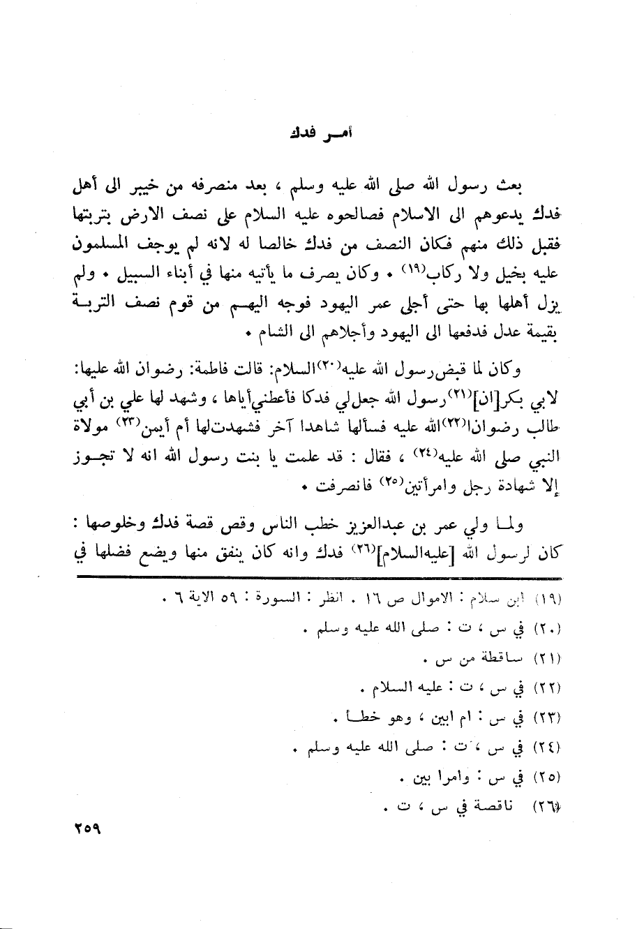 بعث رسول الله صلى الله عليه وسلم، بعد منصرفه من خيبر الى أهل فدك يدعوهم الى الاسلام فصالحوه عليه السلام على نصف الارض بتربتها فقبل ذلك منهم فكان النصف من فدك خالصا له لانه لم يوجف المسلمون عليه بخيل ولا ركاب «19» . وكان يصرف ما يأتيه منها في أبناء السبيل. ولم يزل أهلها بها حتى أجلى عمر اليهود فوجه اليهم من قوم نصف التربة بقيمة عدل فدفعها الى اليهود وأجلاهم الى الشام.